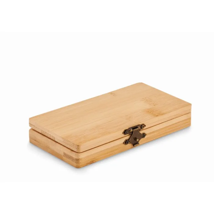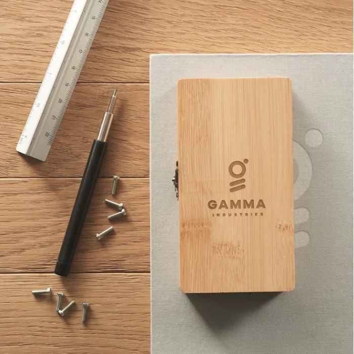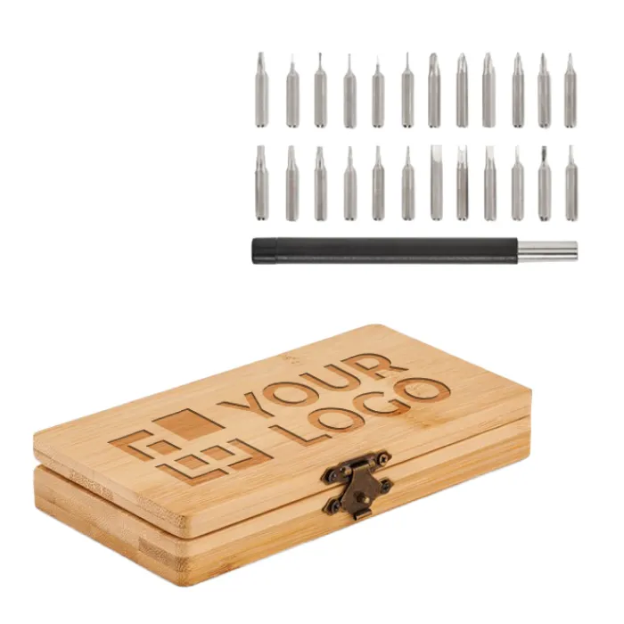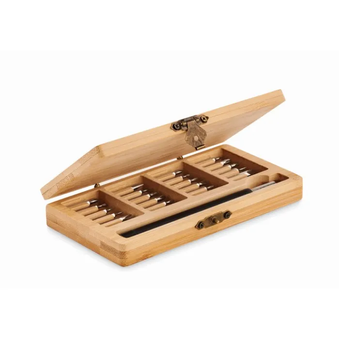 Kit di piccoli cacciaviti di precisione composto da 24 pezzi per riparazioni. Contenuti in una scatola di bambù con chiusura a fibbia.