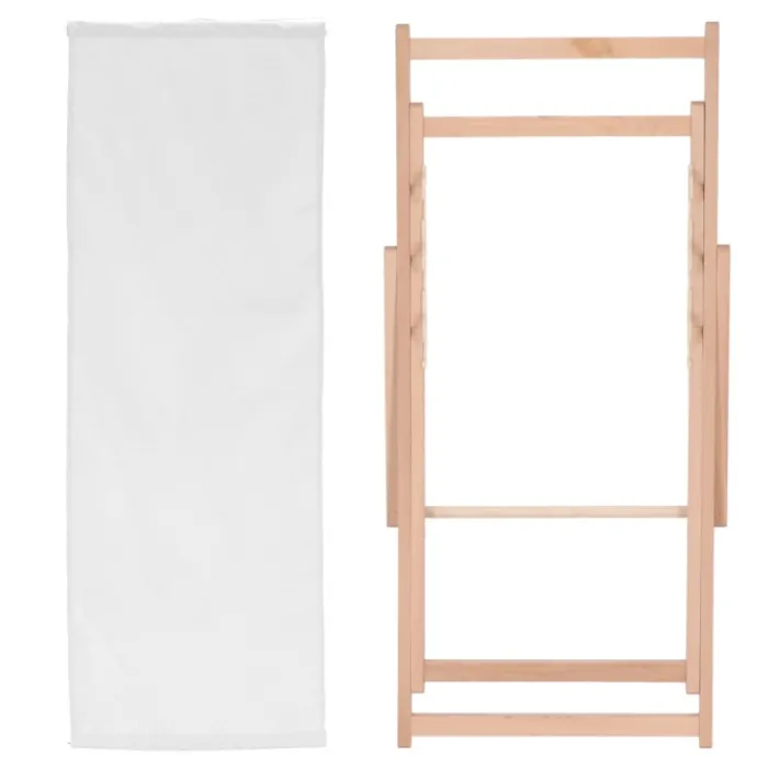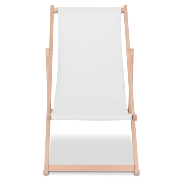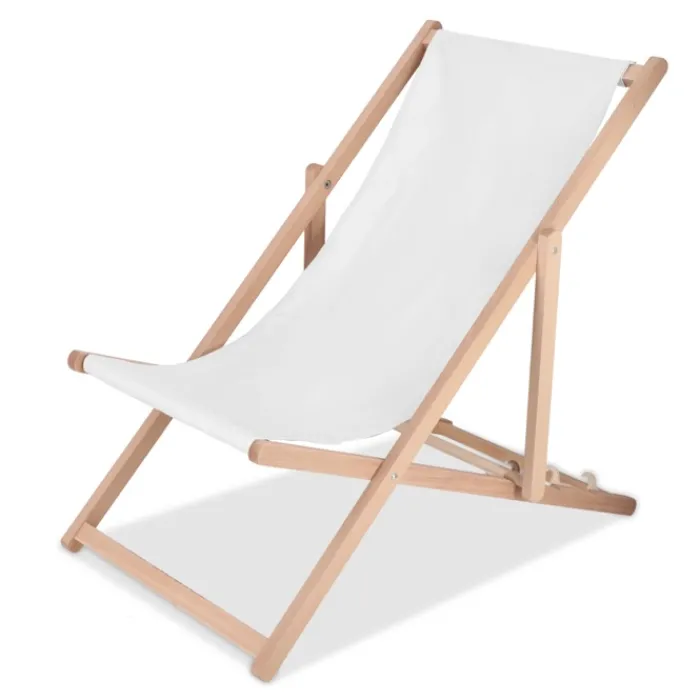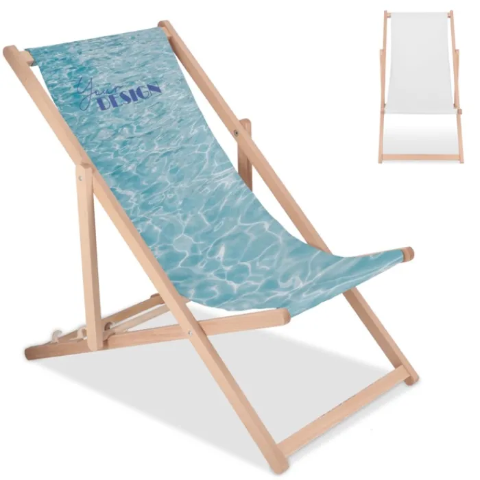 Rilassati con stile in piscina o in spiaggia con questa sedia sdraio in legno. Il tessuto in poliestere è stampabile a colori. Leggera, portatile e regolabile. Prodotta in Europa, supporta fino a 110 kg.
