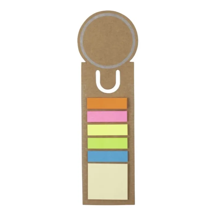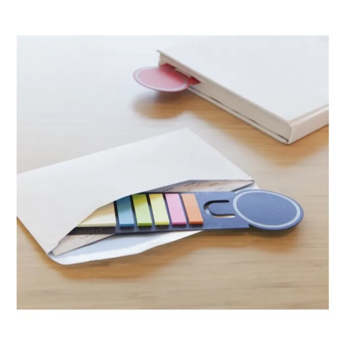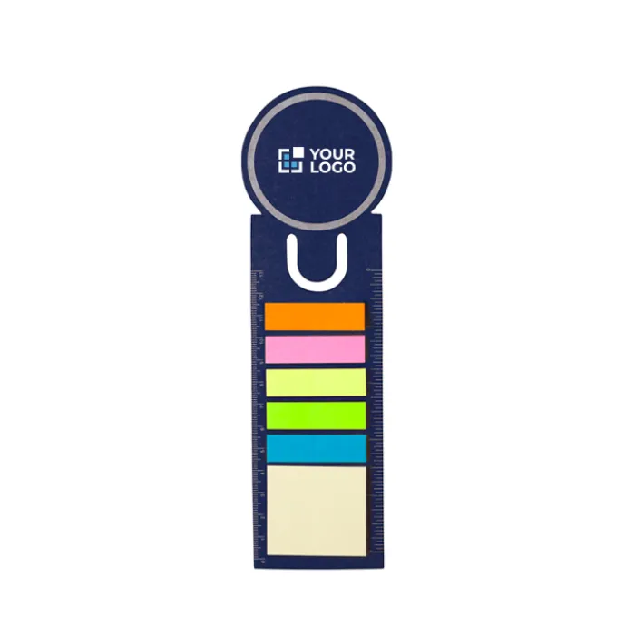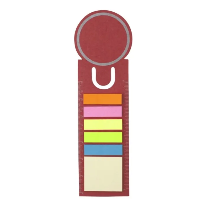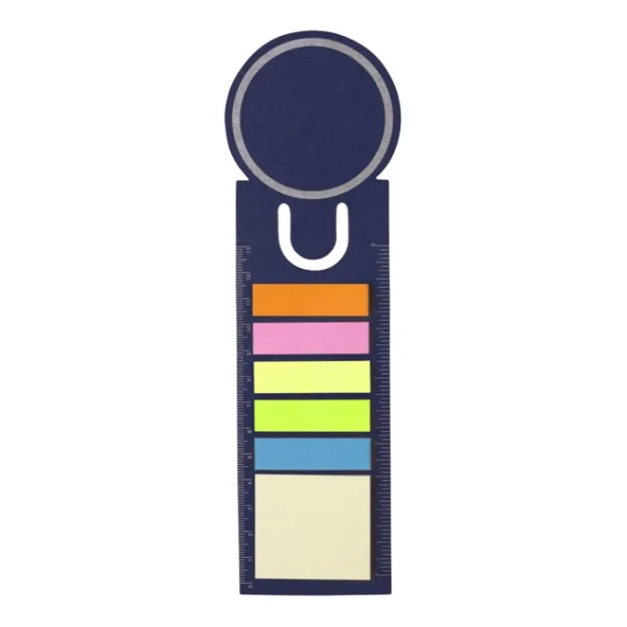 Segnalibro in cartone con estremità arrotondata. Include righello a due misure (centimentri e pollici), memo sticker in vari colori da 4 x 4,5 cm.