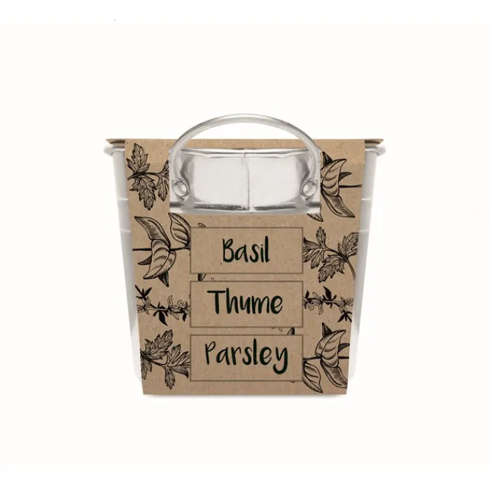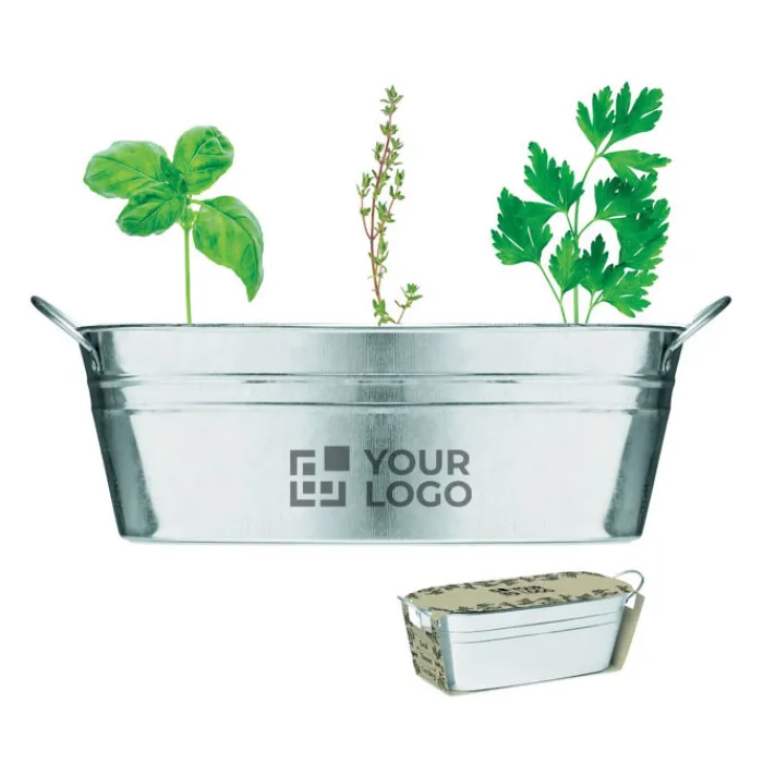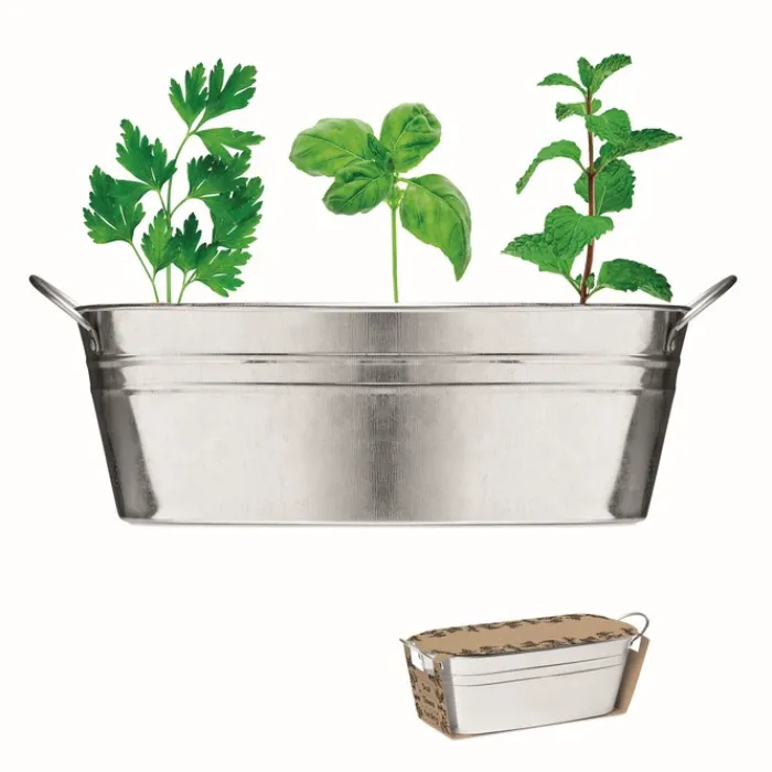 Grande vaso in zinco che comprende una selezione di semi di 3 erbe aromatiche (basilico, timo e prezzemolo) e il relativo terriccio per piantarli. Prodotto nell’UE.