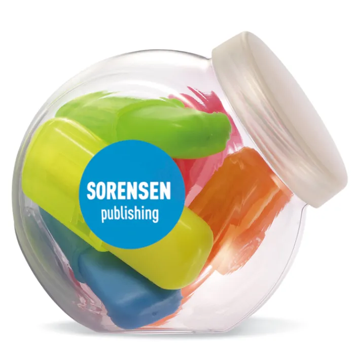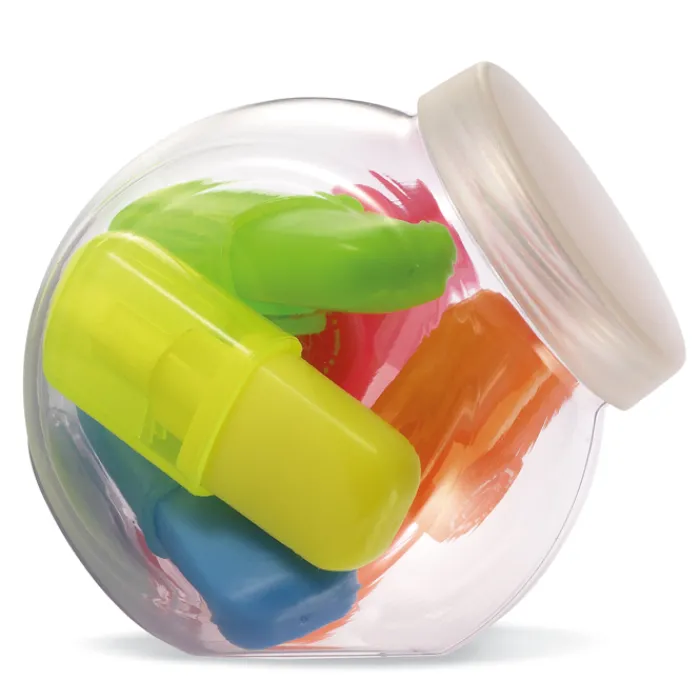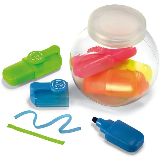 Set 5 evidenziatori (giallo, verde, azzurro, arancione e rosa) in contenitore a forma di boccia. In PET.