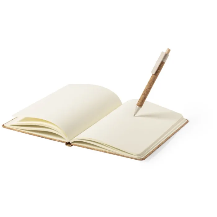 Set composto da taccuino e penna, realizzati con materiali che riflettono un approccio naturale e contemporaneo. Il taccuino presenta una copertina rigida in sughero naturale e 80 fogli lisci, per annotazioni rapide o schizzi. La penna, con corpo in sughero e dettagli in paglia di grano, è dotata di meccanismo a pulsante e inchiostro nero. Il set è confezionato in un astuccio di cartone fustellato. Un’eccellente opzione per comunicare un’immagine curata e responsabile, unendo utilità, design e attenzione all’ambiente.