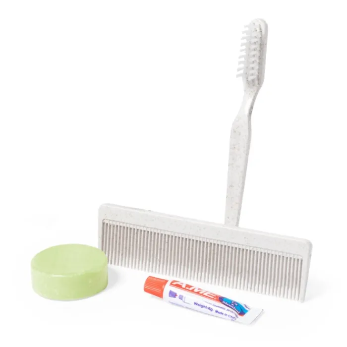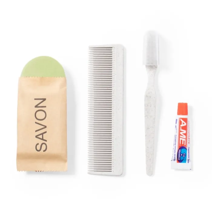 Set da toeletta essenziale presentato in una scatola singola di design kraft. Contiene uno con spazzolino e un pettine realizzati in fibra di grano; un dentifricio in tubo da 6 g con tappo a vite, ed una saponetta da 20 g.