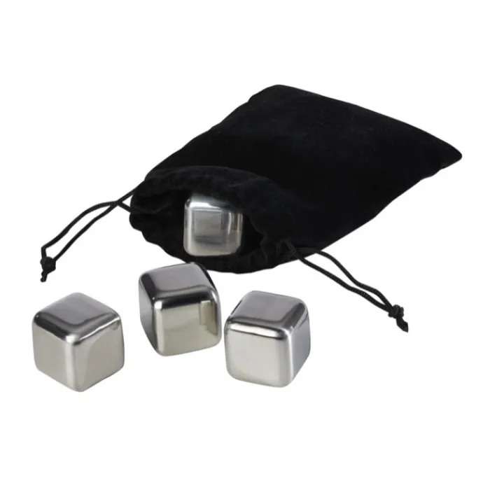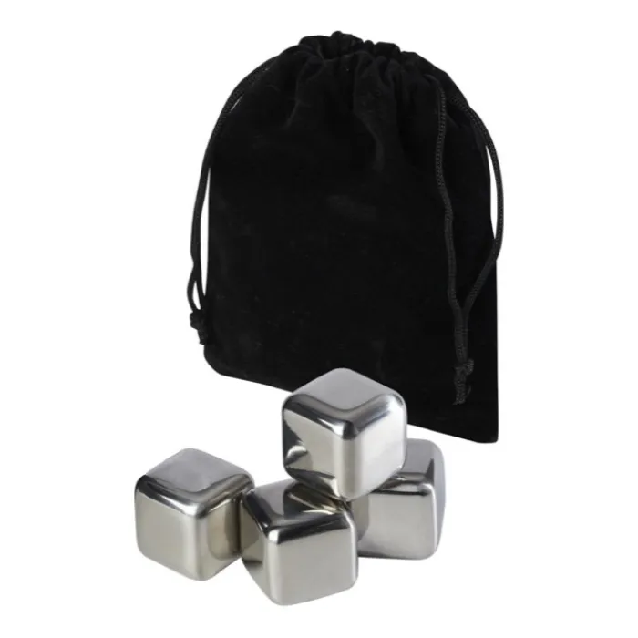 Set di 4 cubetti di ghiaccio riutilizzabili in acciaio inossidabile, forniti in un sacchetto di velluto. Raffreddano le bevande in modo rapido ed efficace, preservandone il sapore.