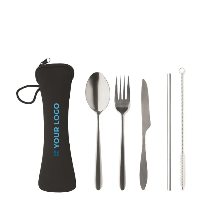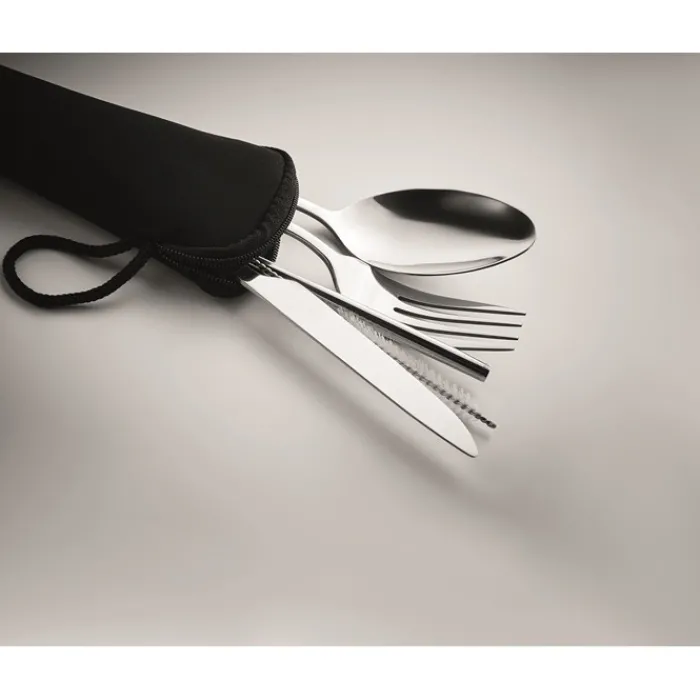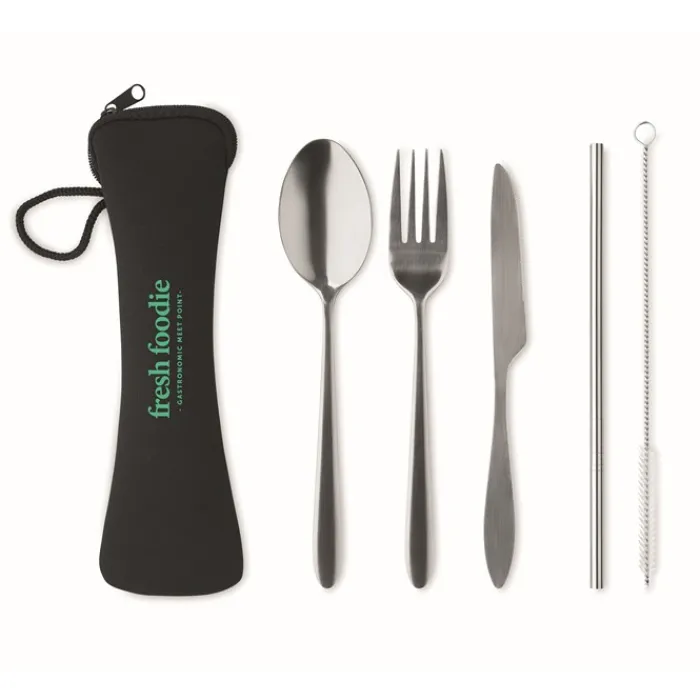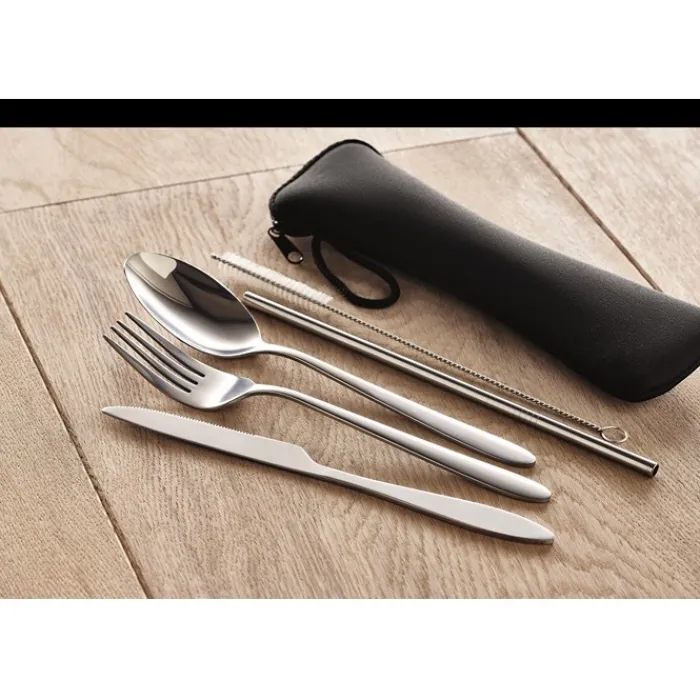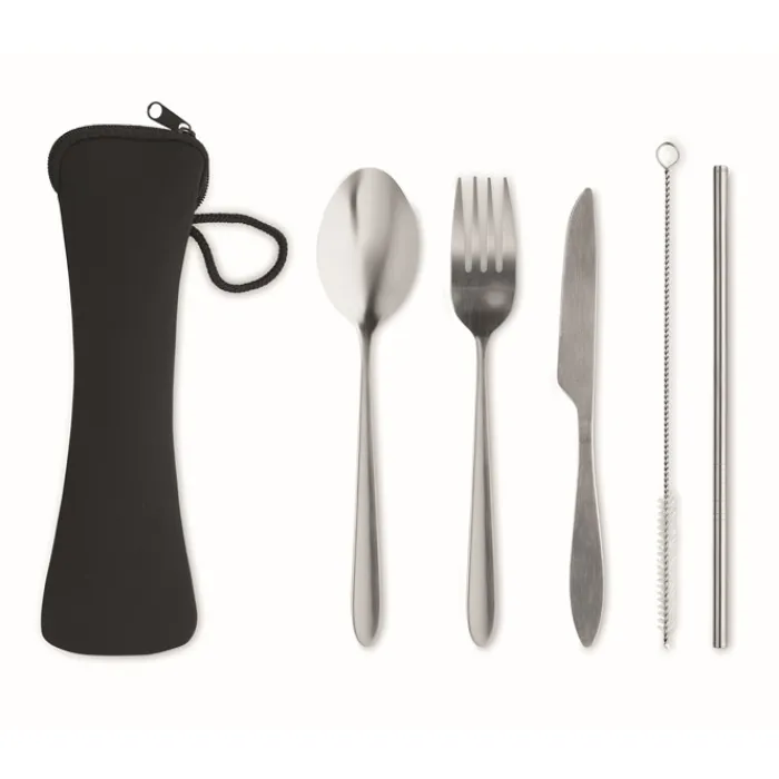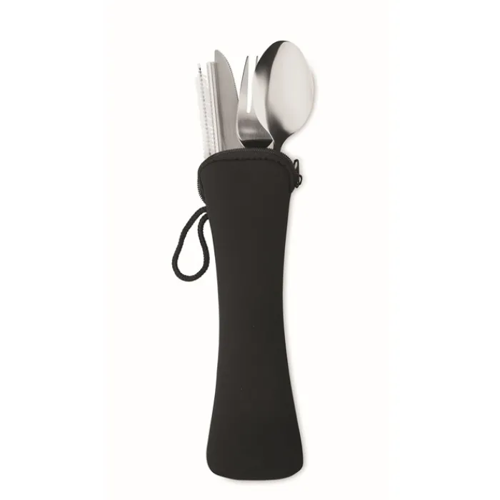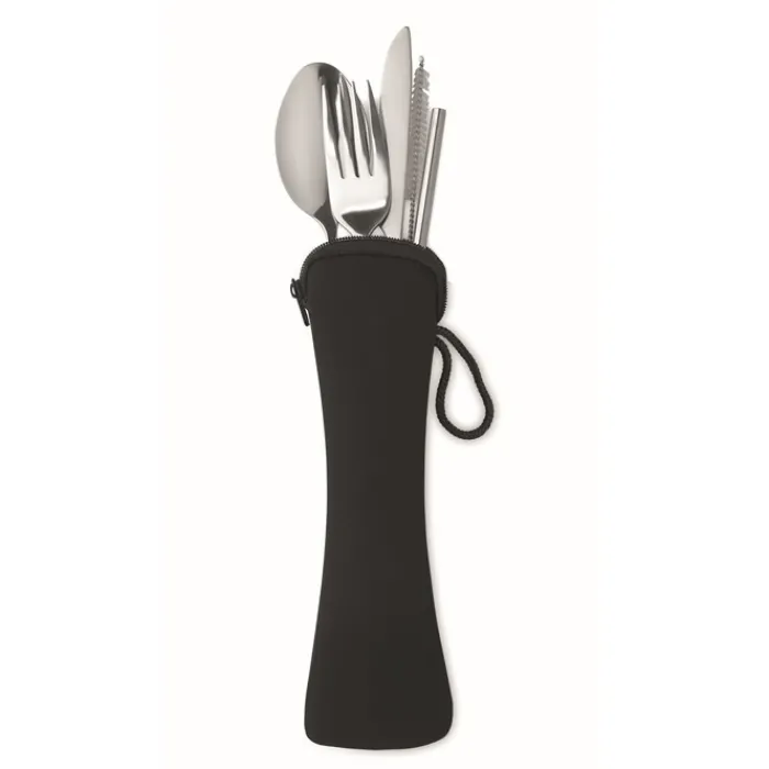 Set di posate in acciaio inossidabile contenute in un sacchetto di neoprene nero. Composto da forchetta, coltello, cucchiaio, cannuccia e spazzolina per la pulizia della cannuccia.