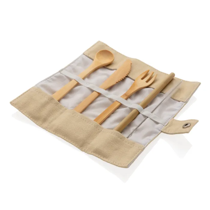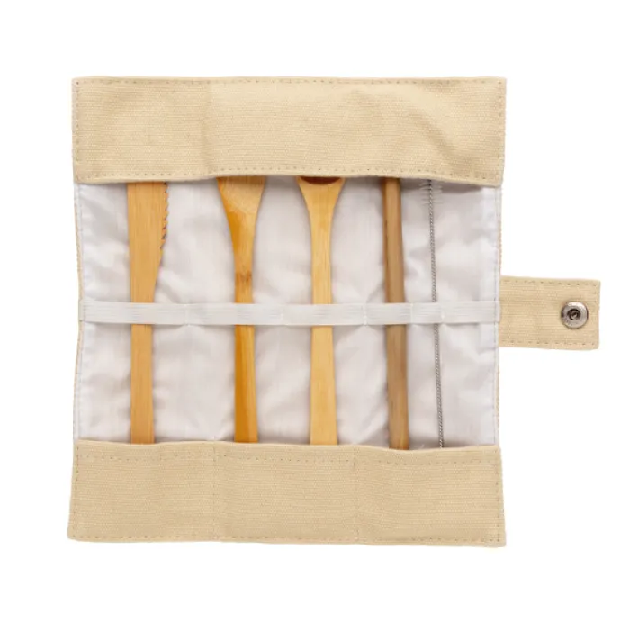 Pratico set di utensili riutilizzabili in bambù, da portare ovunque per ridurre l’uso di plastica monouso. Il bambù è un materiale naturale, resistente e biodegradabile, che al termine del suo ciclo di vita non genera rifiuti inquinanti. Il set comprende cucchiaio, forchetta, coltello, cannuccia e spazzolino pulitore, tutto contenuto in un’elegante borsa da viaggio in tela, leggera e facile da trasportare. Un’opzione ecologica che promuove abitudini sostenibili e comunica un forte messaggio di responsabilità ambientale, rafforzando l’immagine di impegno della tua azienda verso il pianeta.
