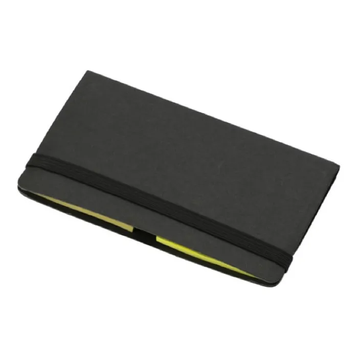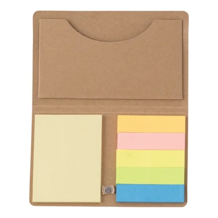 Set memo con memo sticker in vari colori e dimensioni, portatessere interno e chiusura ad elastico.