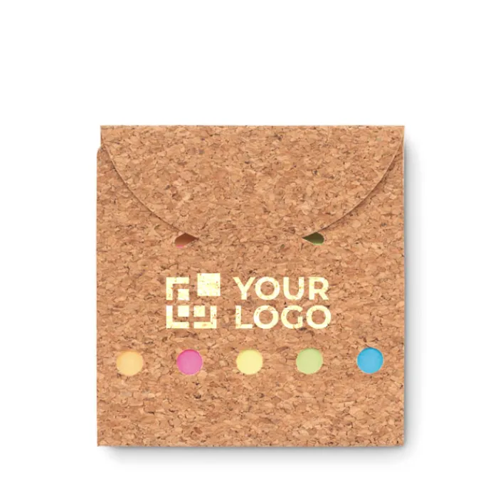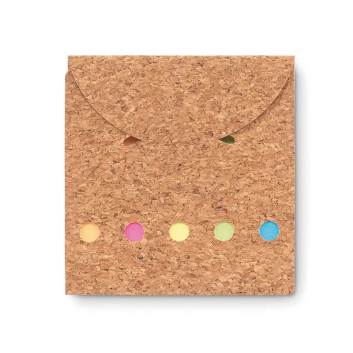 Memopad in sughero con 125 fogli gialli e 25 sticky in 5 colori.