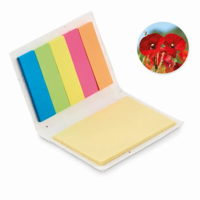 Blocchetto contenente 25 grandi post-it gialli e segnapagina adesivi di 5 colori differenti. La copertina contiene semi di papavero che potranno essere piantati.