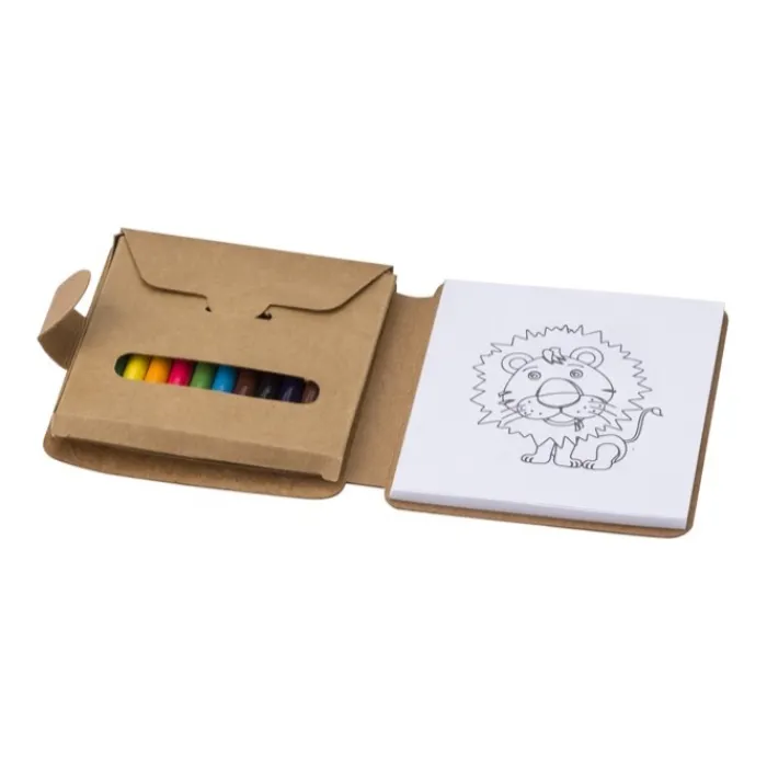 Set da colorare in cartone con 12 matite colorate e 12 disegni, oltre a pagine bianche.