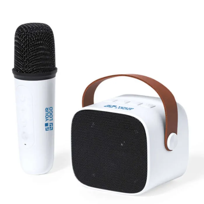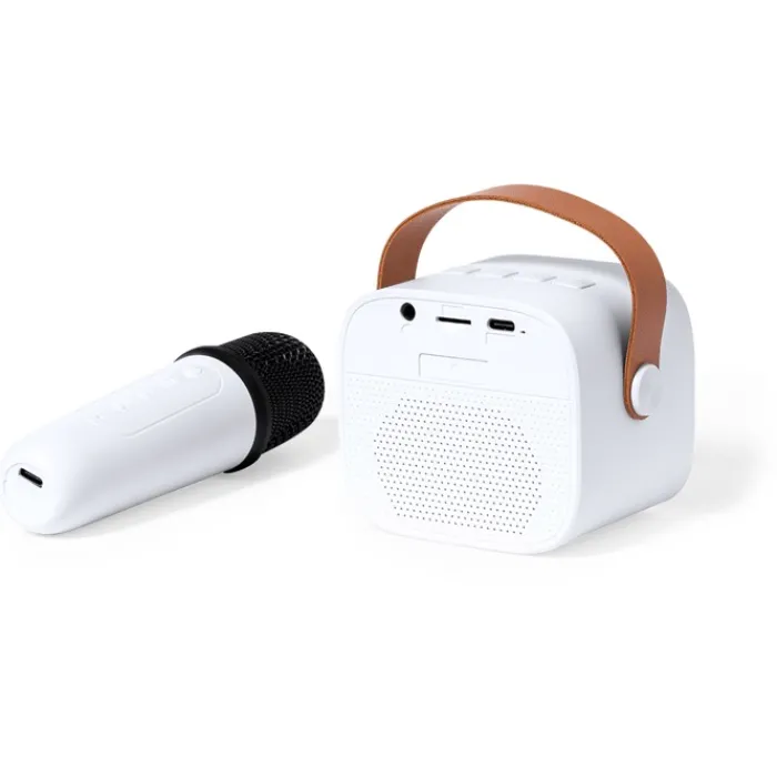 Originale set per il karaoke con altoparlante e microfono. Le sue dimensioni compatte e la facile connessione Bluetooth® lo rendono un accessorio ideale per divertirsi ovunque e in qualsiasi momento. L’altoparlante a cubo ha una comoda maniglia per il trasporto in PU, una potenza di 5W ed una batteria a lunga durata da 1200 mAh. Il microfono coordinato ha un design ergonomico con pulsanti sul manico. Presentato in una scatola di design Kraft. Manuale di istruzioni disponibile in inglese e spagnolo. Se desideri personalizzare il microfono, contatta l’assistenza clienti.