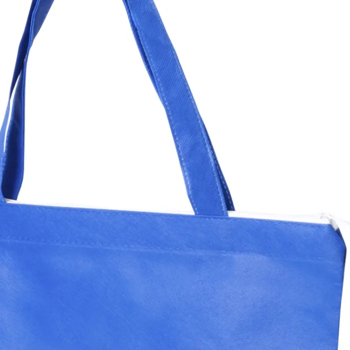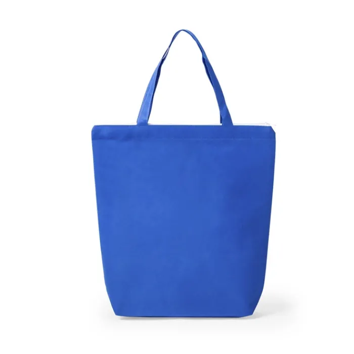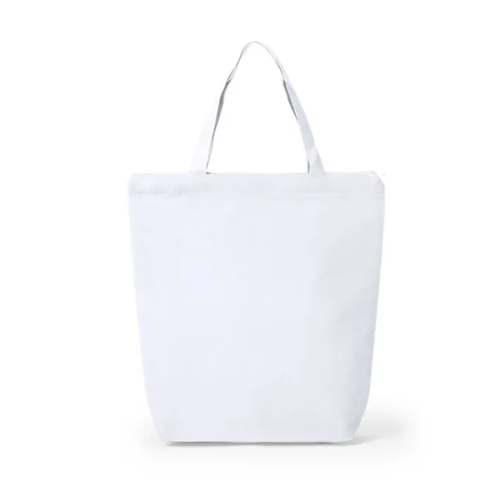 Shopper in tessuto non tessuto da 90 g/m² con chiusura a cerniera in colore bianco, soffietto da 11 cm, manici da 45 cm e finiture cucite. Può sopportare fino a 6 kg di peso.