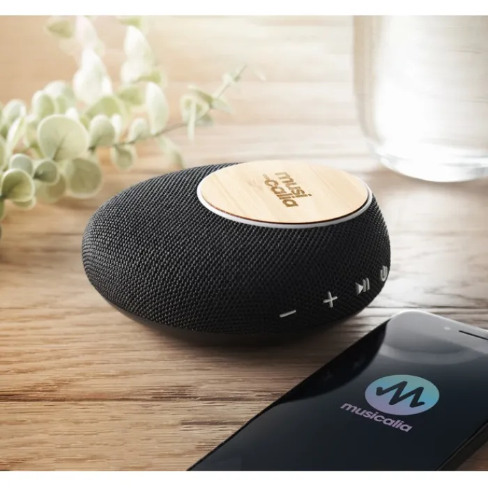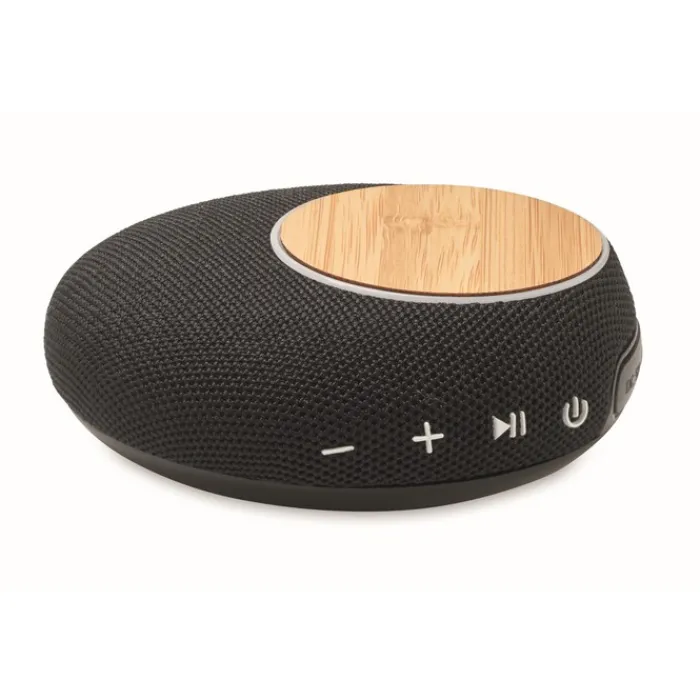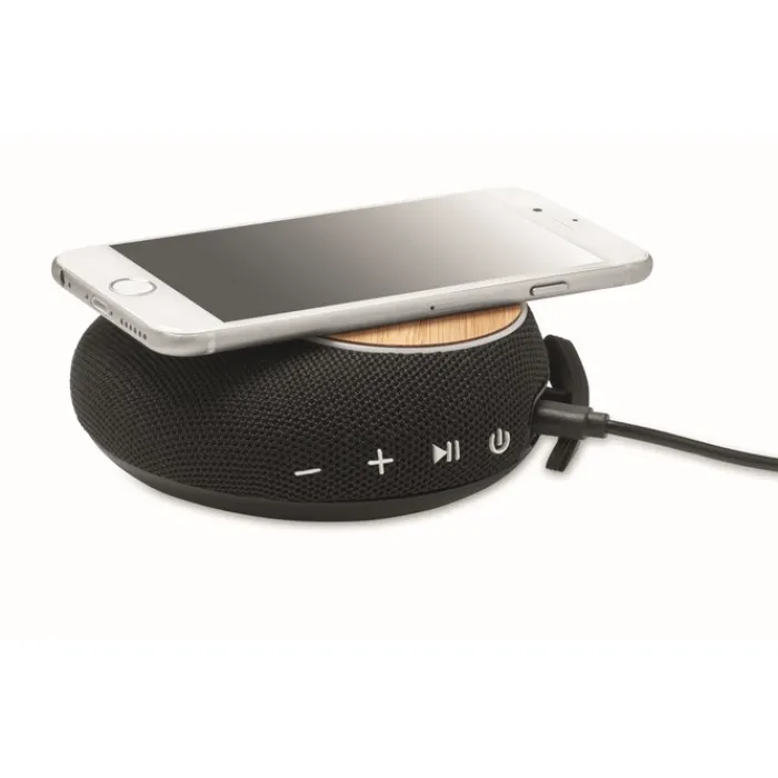 Speaker wireless 5.0 con scocca in ABS e dettaglio in bambù sulla parte superiore. Ha un caricatore wireless integrato da 10 W ed un power bank da 4000 mAh per ricaricare lo smartphone. Batteria ricaricabile integrata da 1800 mAh. Uscita DC 9V/1.1A.