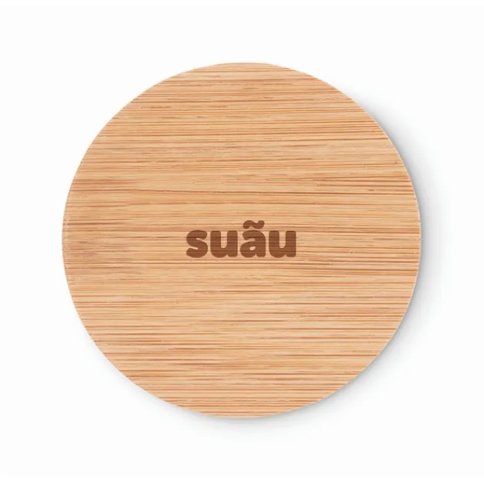 Specchietto rotondo con rivestimento in bambù. Presentato in un sacchettino di cotone personalizzabile con chiusura a coulisse.