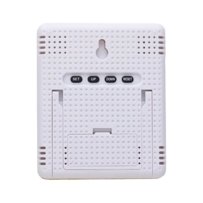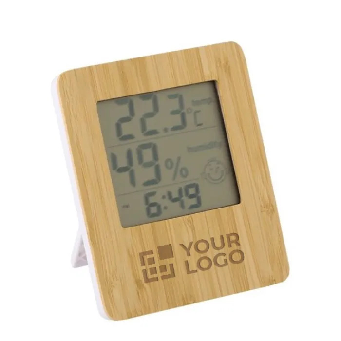 Stazione meteorologica in bambù e ABS, con supporto pieghevole. Include funzioni come l’indicazione dell’ora, dell’anno, della temperatura, dell’umidità. Batterie UM4-AAA-LR03 incluse.