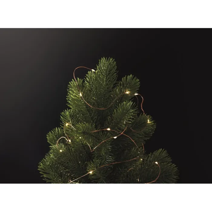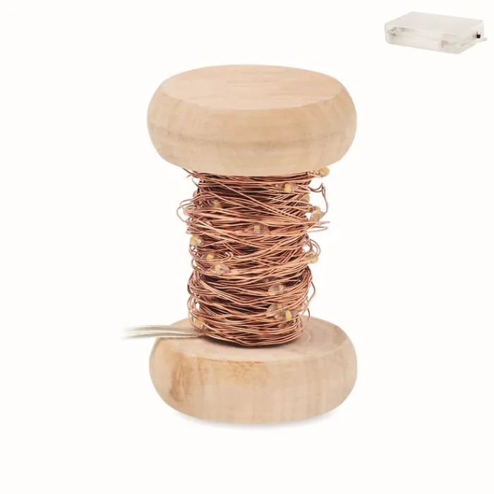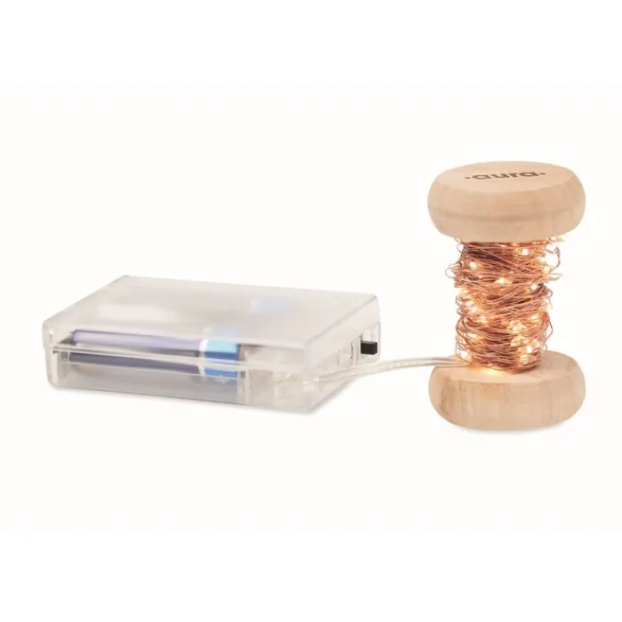 Stringa di 50 luci LED gialle calde su una bobina di legno. Lunghezza: 5 m. Funziona con 3 batterie AA non incluse. Il legno è un materiale naturale, per cui possono verificarsi leggere variazioni di colore tra un articolo e l’altro.