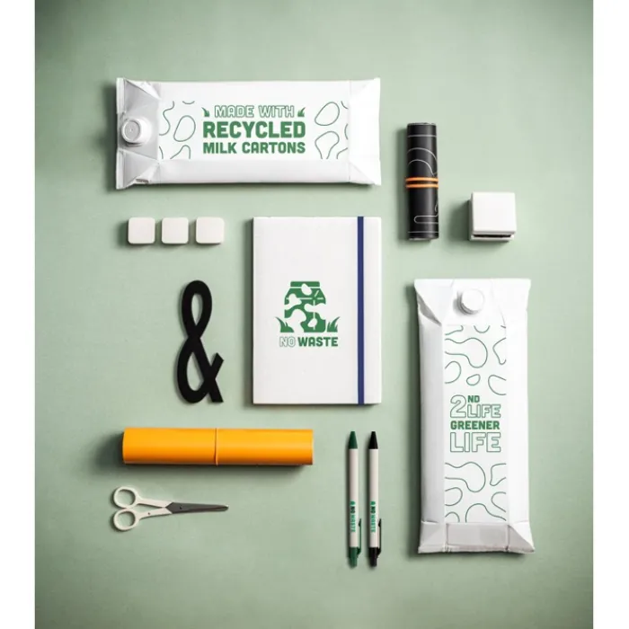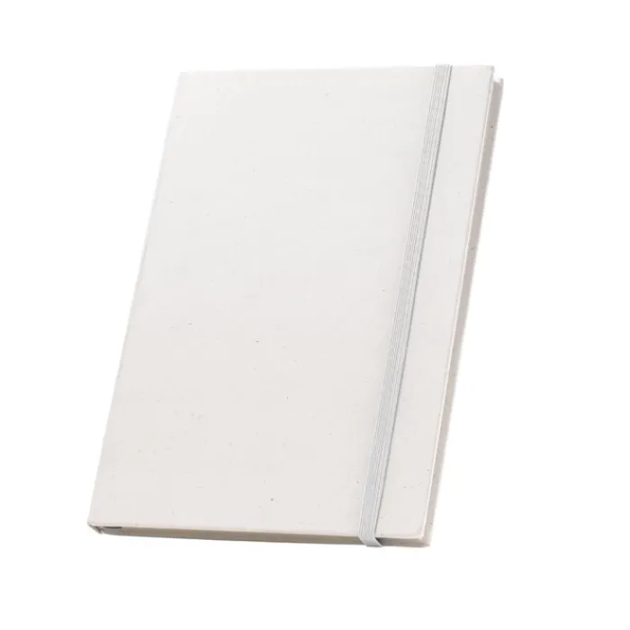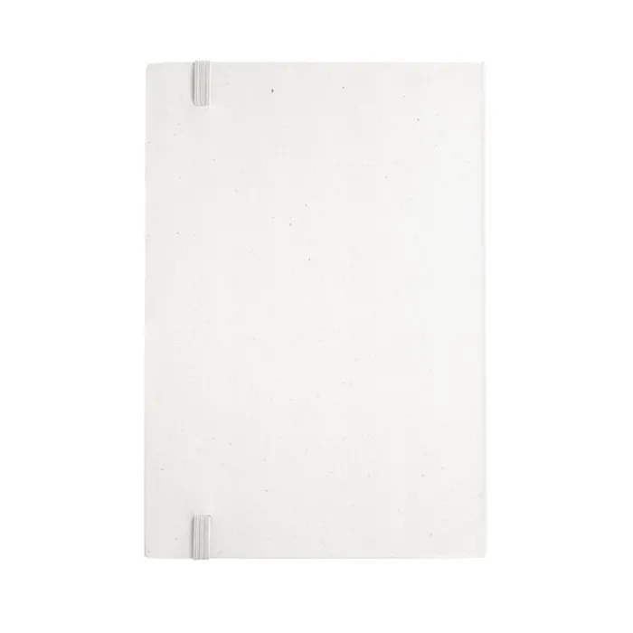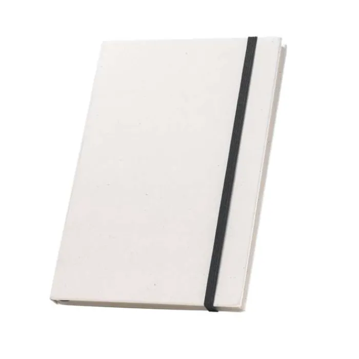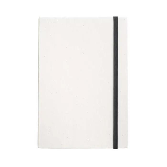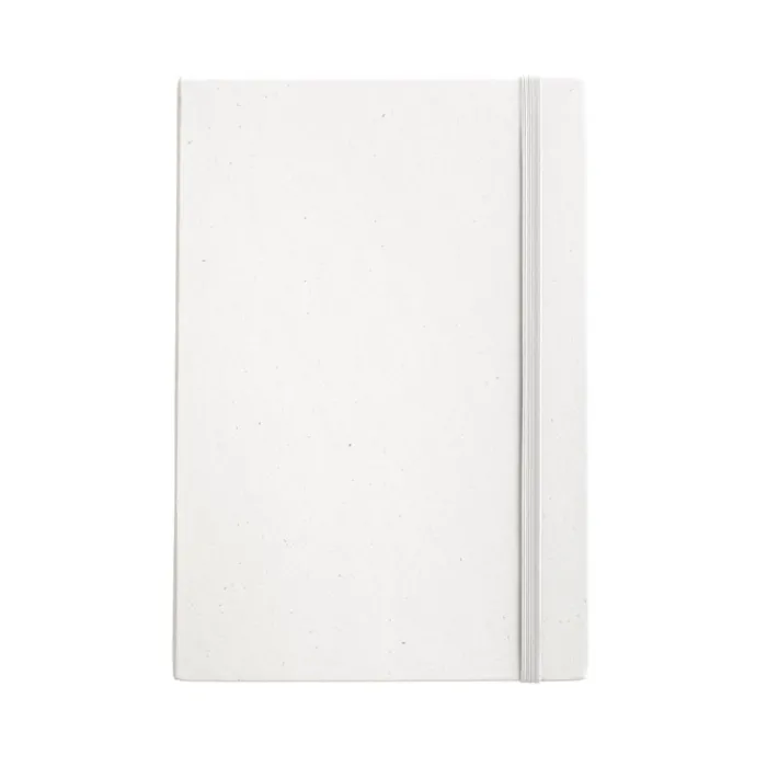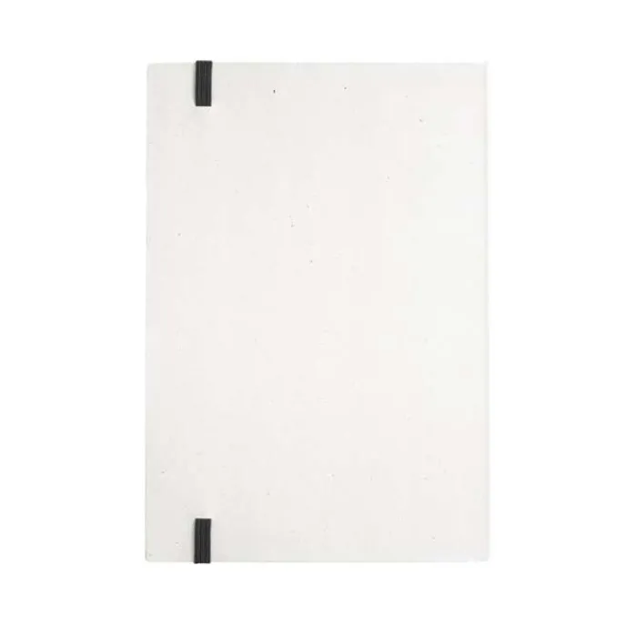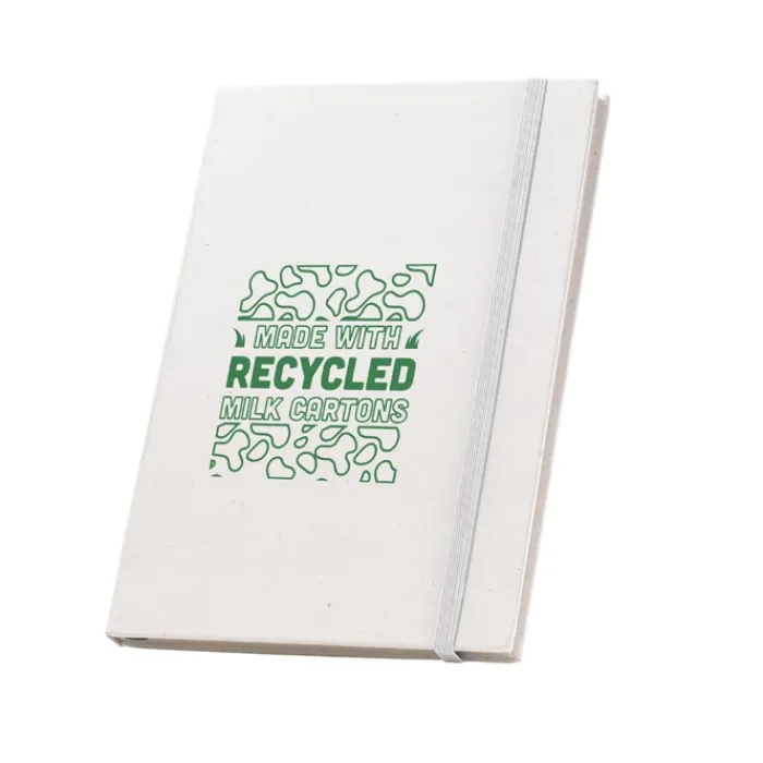 Taccuino formato A5 con copertina rigida realizzata con i cartoni del latte riciclati. Contiene 160 pagine a righe colore avorio, realizzate con carta riciclata. Nastrino segnapagina ed elastico di chiusura.