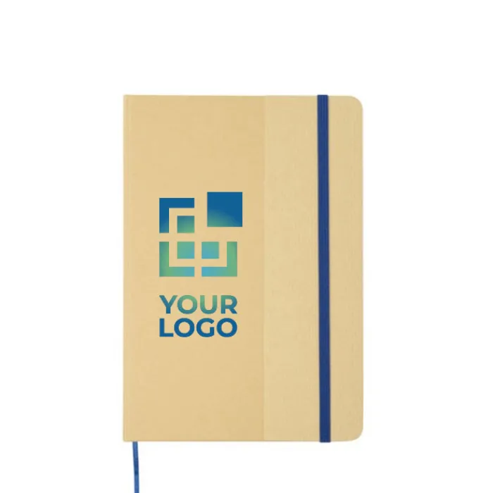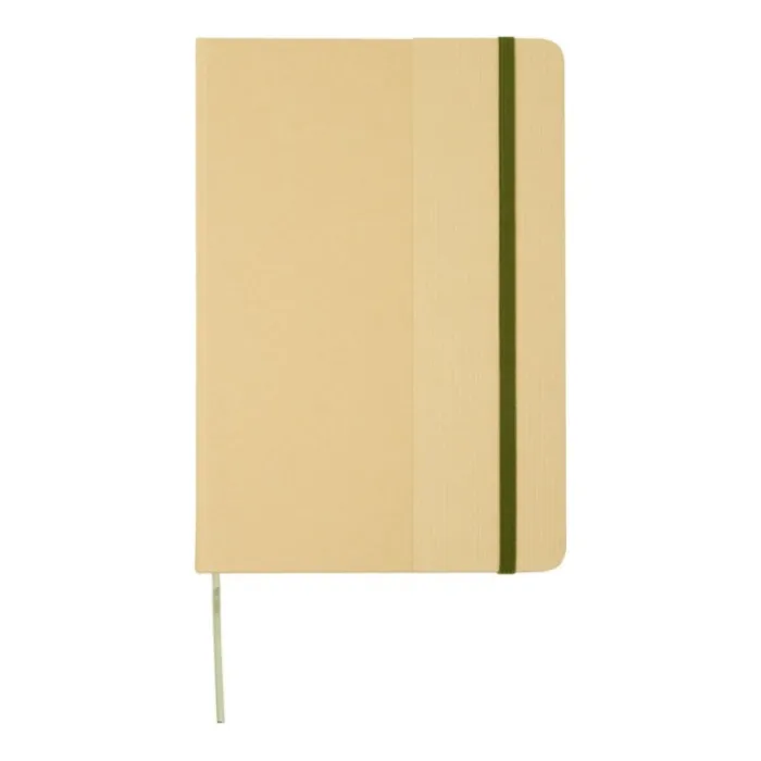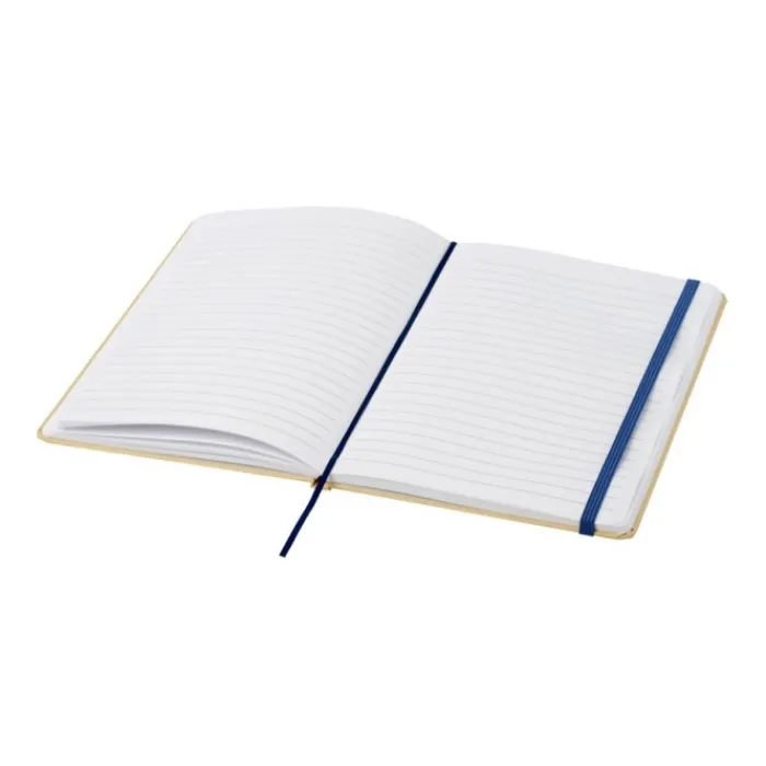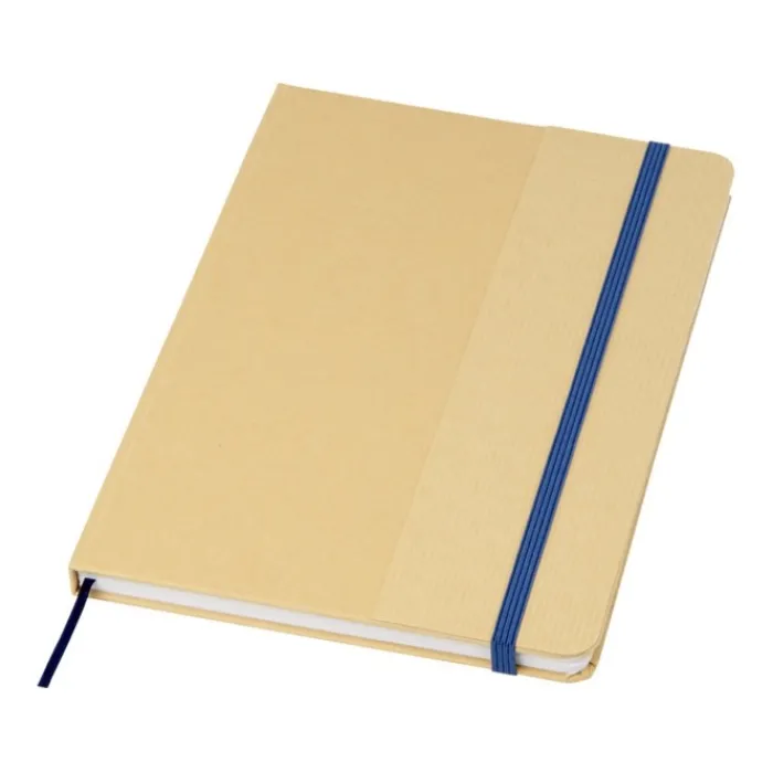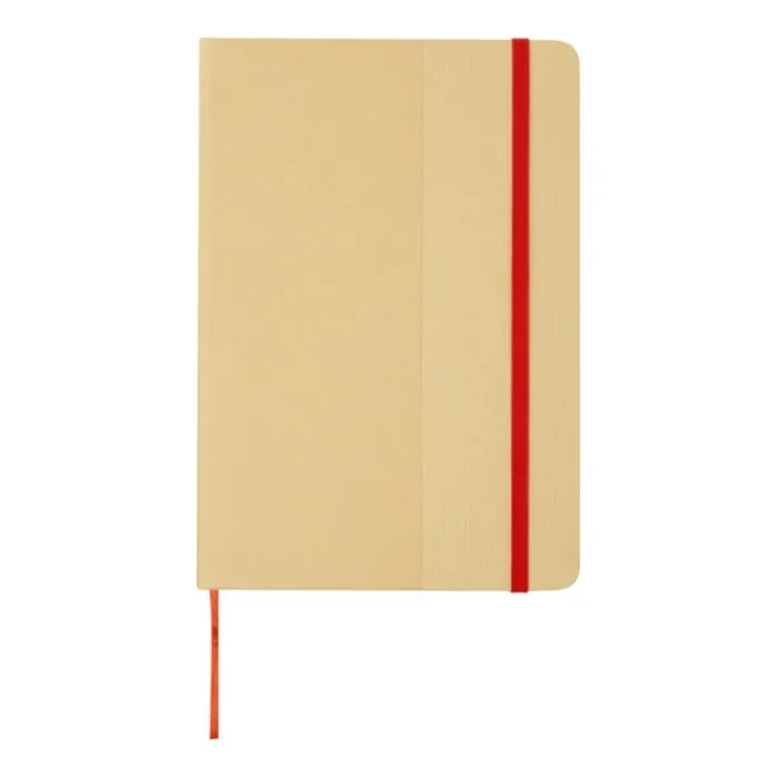 Taccuino formato A5 con copertina rigida in cartone riciclato certificato FSC Mix. Contiene 80 fogli a righe di carta da 70 g/m². Ha una chiusura con elastico, un nastrino segnapagina e angoli arrotondati.