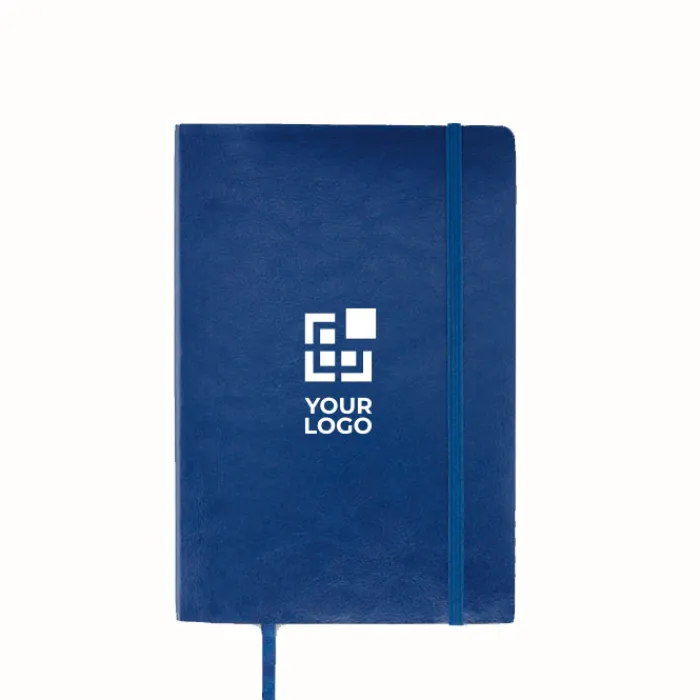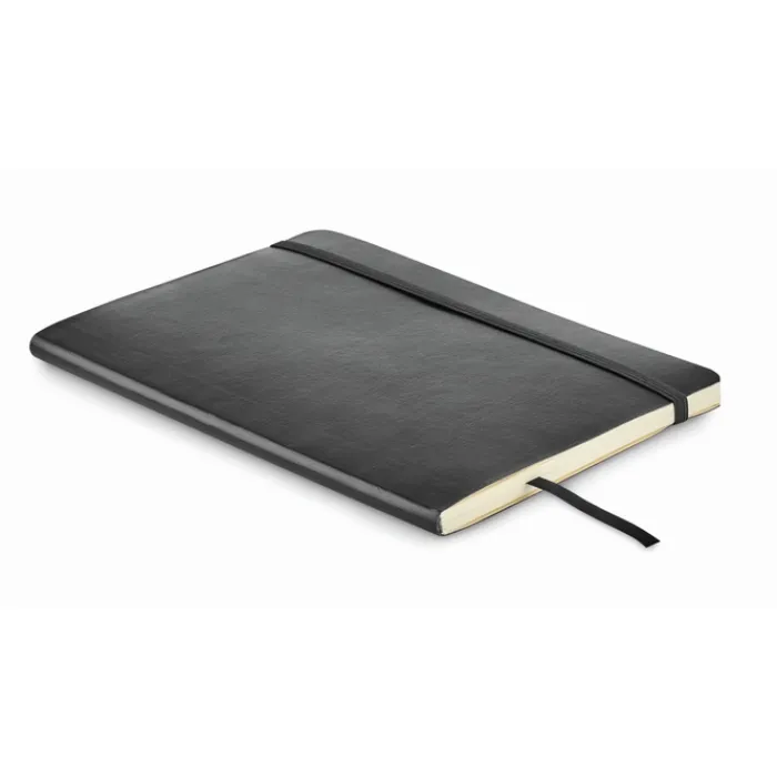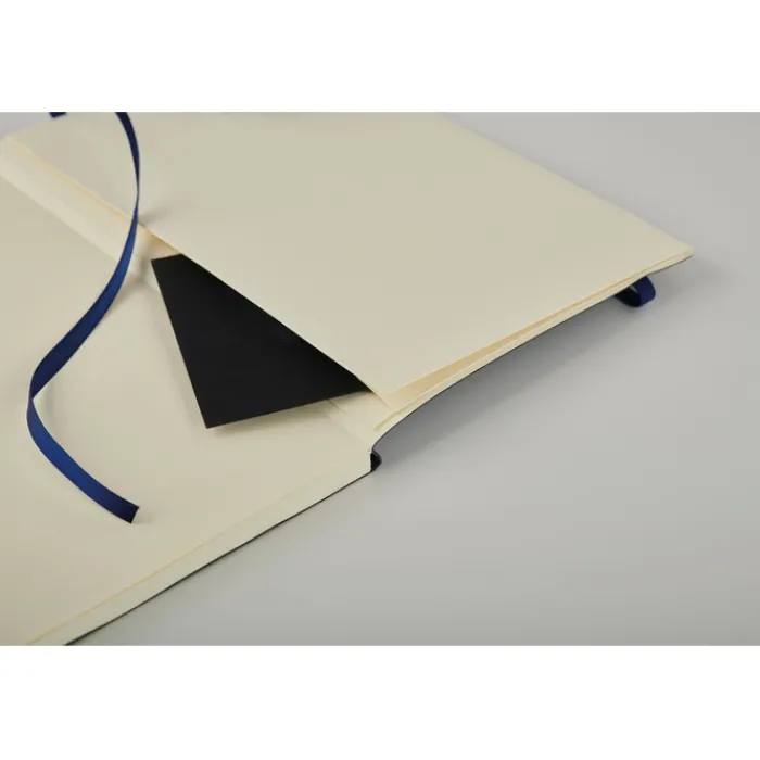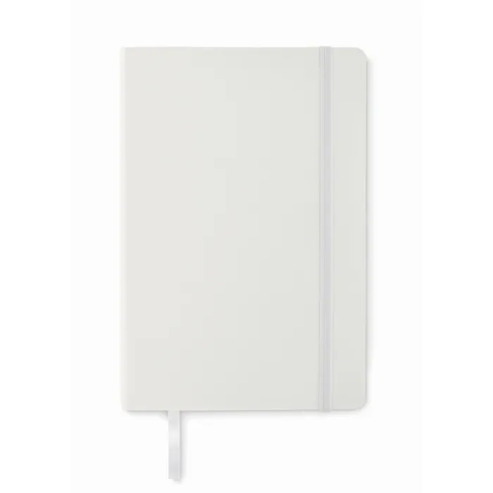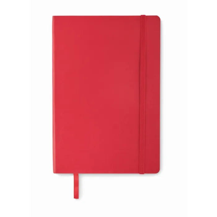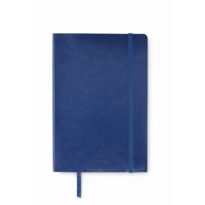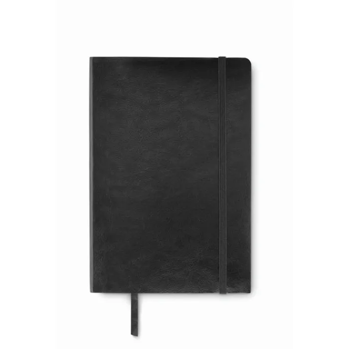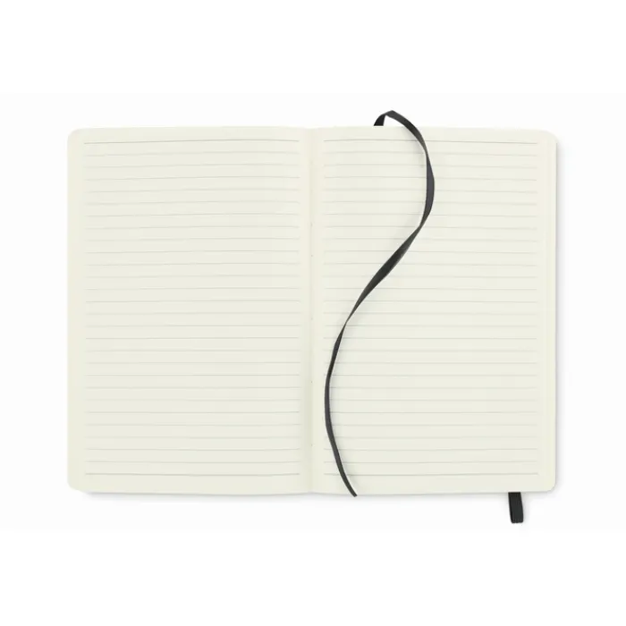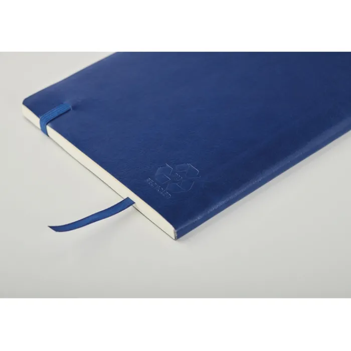Taccuino formato A5 con copertina in morbido PU riciclato (81% poliestere riciclato e 19% PU) Contiene 160 pagine a righe (80 fogli) di carta riciclata. Elastico di chiusura e nastrino segna pagina abbinato. Tasca interna sul retro.