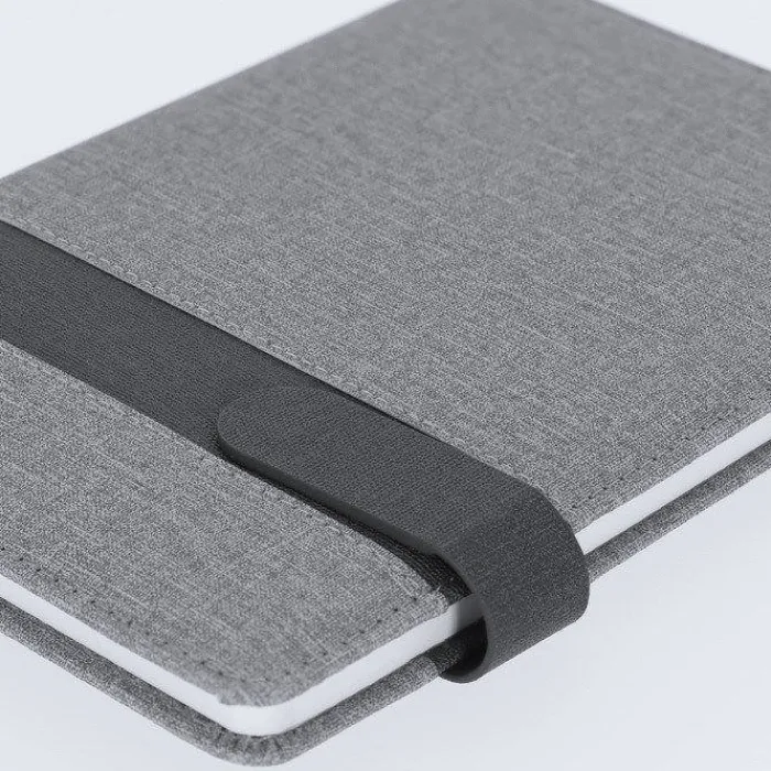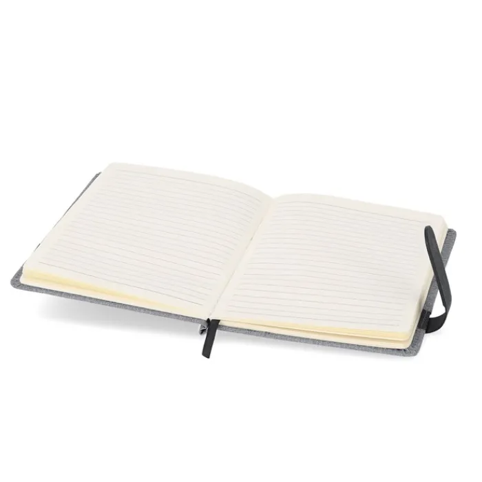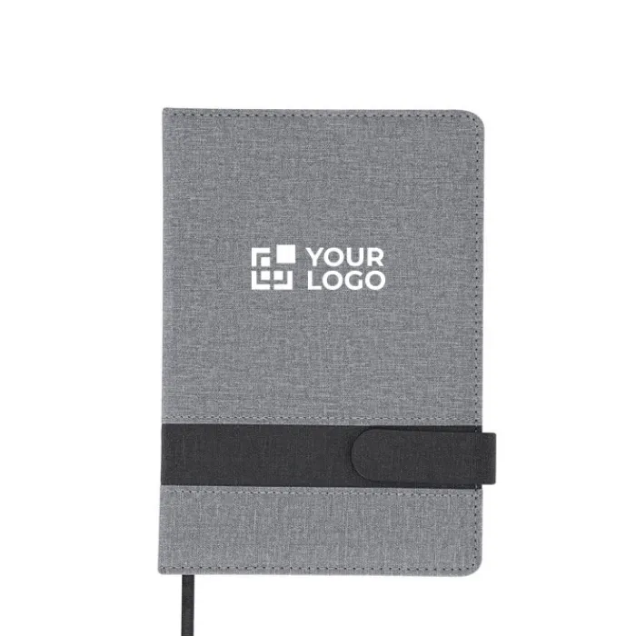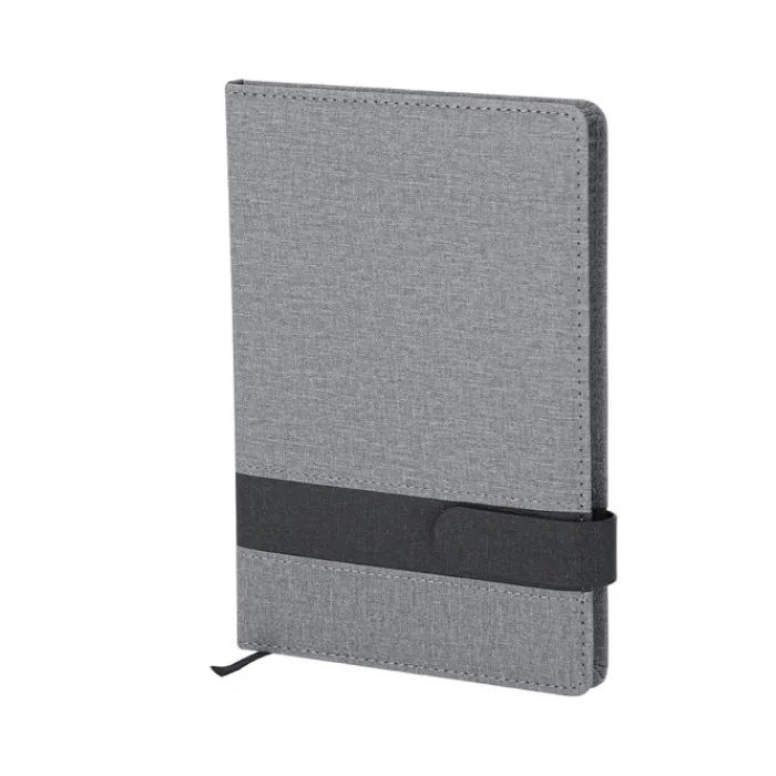 Taccuino A5 con copertina realizzata in pelle PU. Design elegante grigio con banda di chiusura magnetica nera e nastrino segnapagina coordinato in tessuto. Contiene 80 fogli a righe color crema.