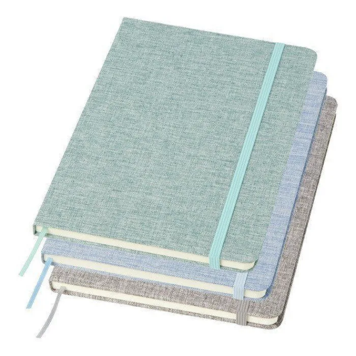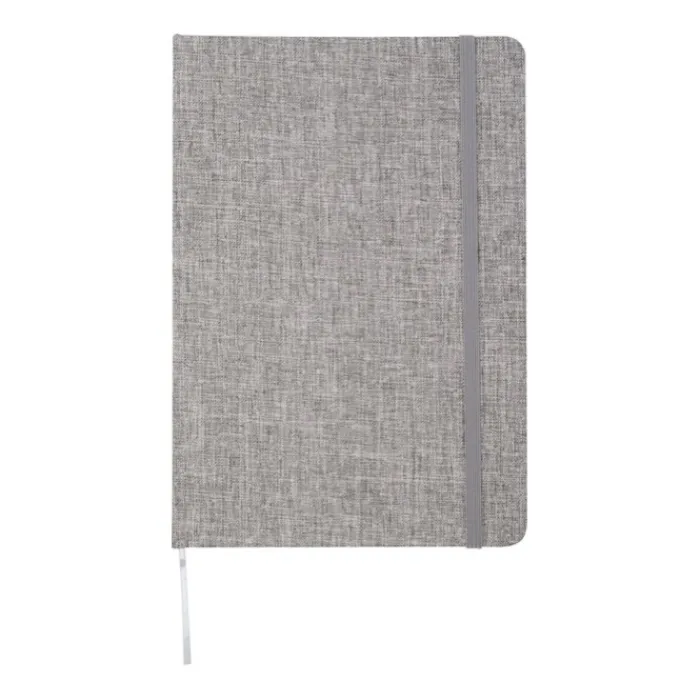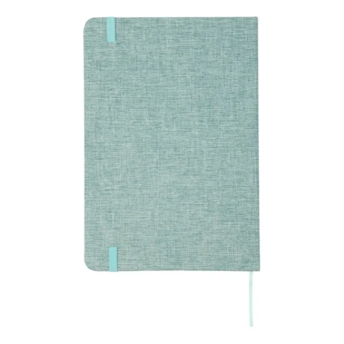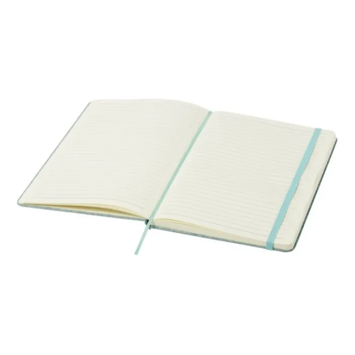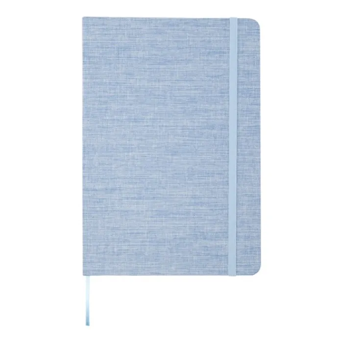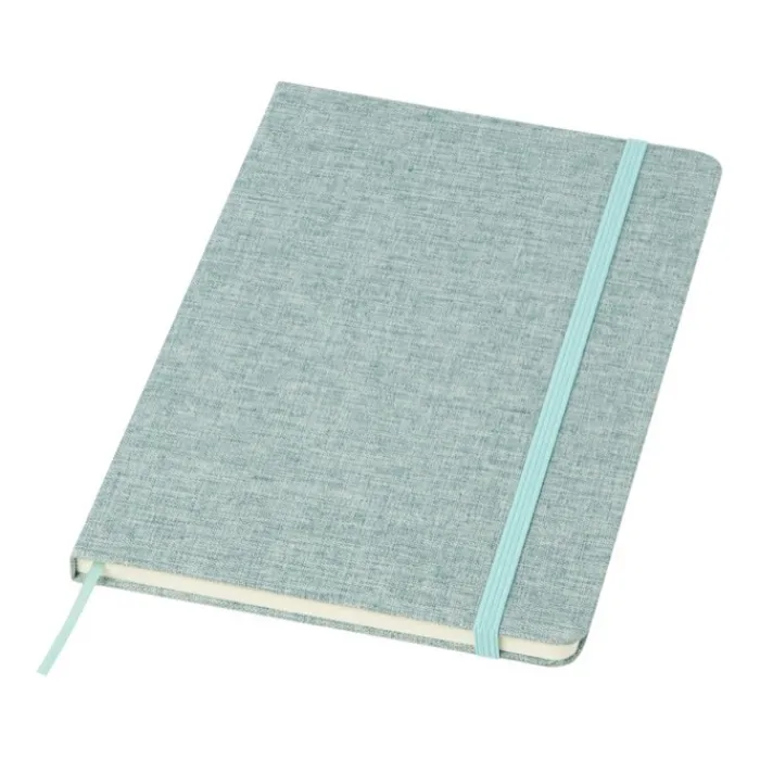 Taccuino formato A5 con copertina rigida in cotone riciclato con 80 fogli a righe in carta da 70 g/m². Ha una chiusura con elastico, un nastrino segnapagina e angoli arrotondati.