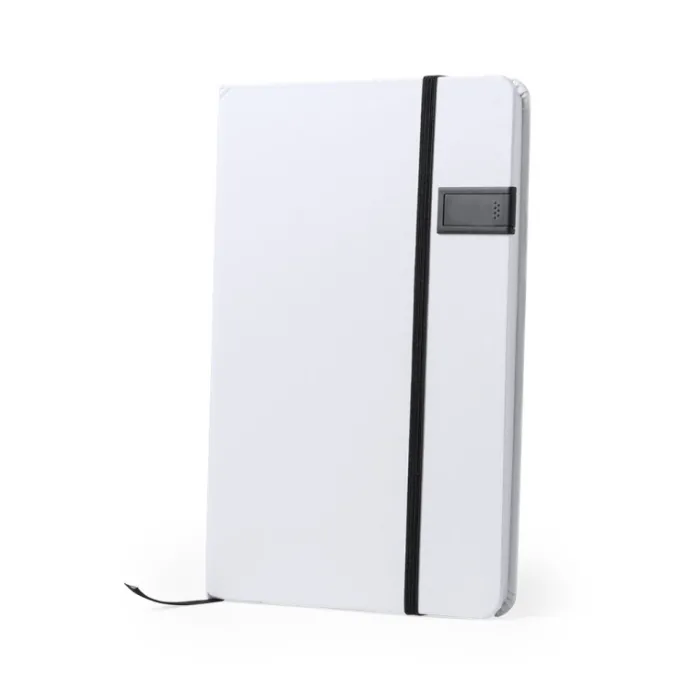 Taccuino dal design elegante in colore bianco, con una pratica memoria USB da 16GB integrata nella copertina frontale, che lo rende uno strumento versatile per l’ambiente professionale. Dotato di elastico di chiusura, segnalibro e memoria coordinata, disponibili in una vasta gamma di colori per adattarsi a diversi stili. Include 100 fogli a righe, per prendere appunti, pianificare o annotare idee. Questo taccuino unisce la scrittura tradizionale all’archiviazione digitale, offrendo un valore aggiunto che valorizza l’immagine di un’azienda moderna e tecnologicamente avanzata.