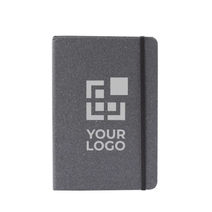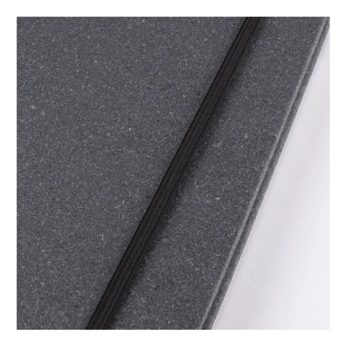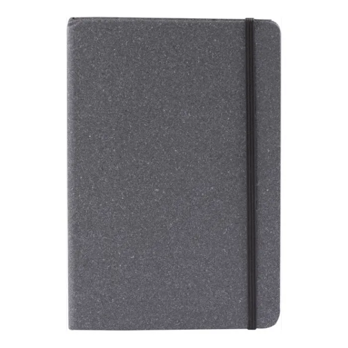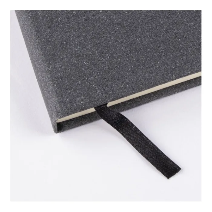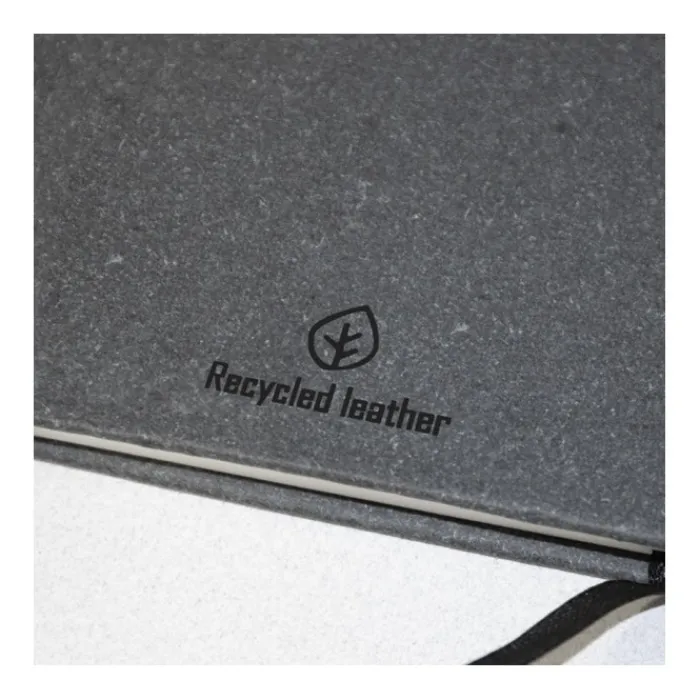 Taccuino formato A5 con copertina rigida in pelle riciclata. Contiene 80 pagine a righe color panna. Dotato di un nastrino segnalibro e chiusura elastica.