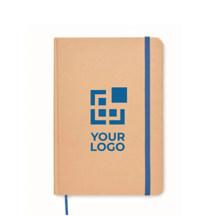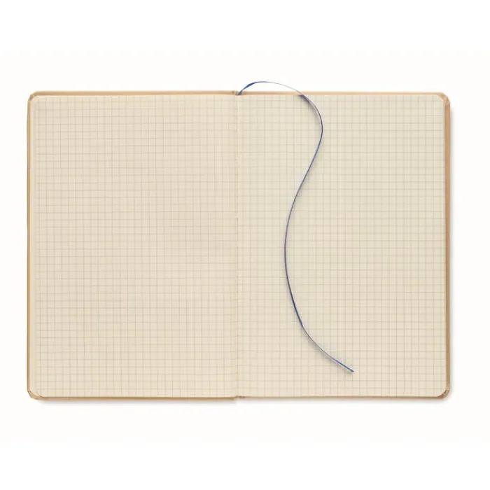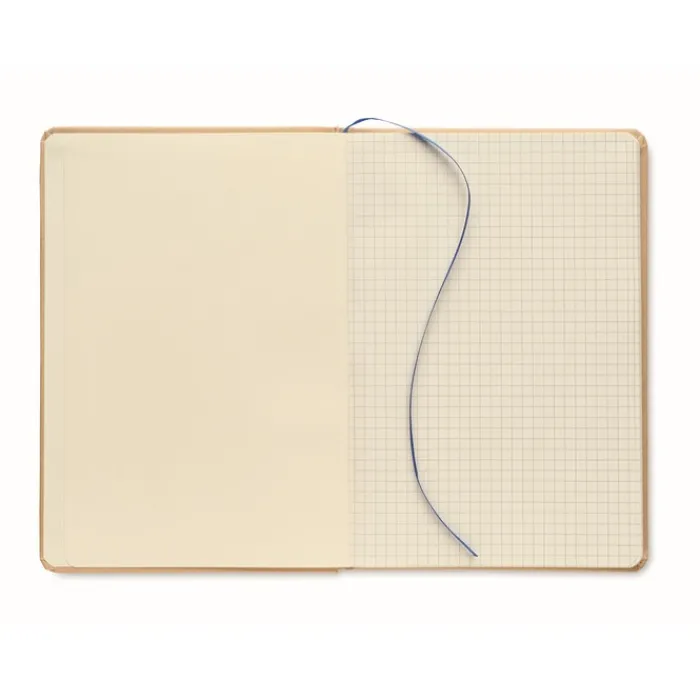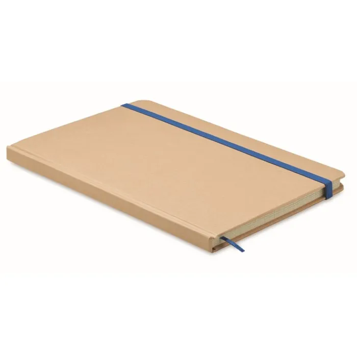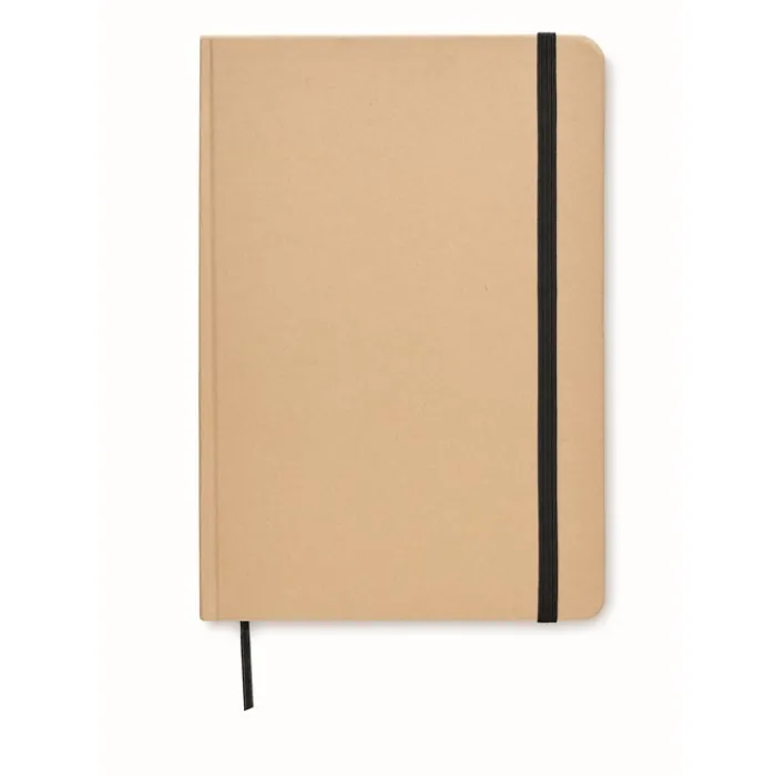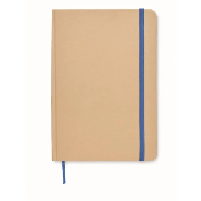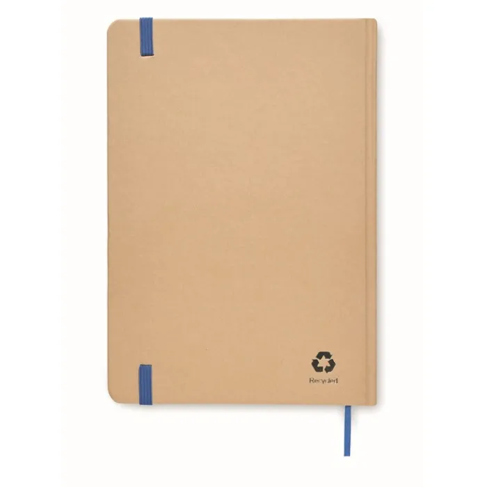 Taccuino formato A5 rilegato con copertina rigida in cartone riciclato. Contiene 160 pagine a quadretti (80 fogli riciclati). Chiusura con elastico e nastrino segna pagina colorato.