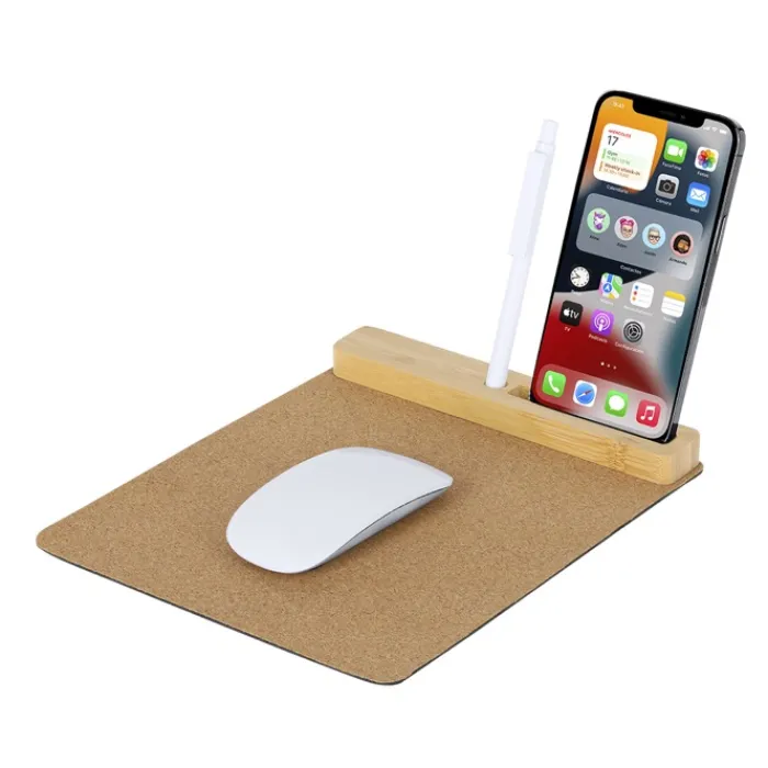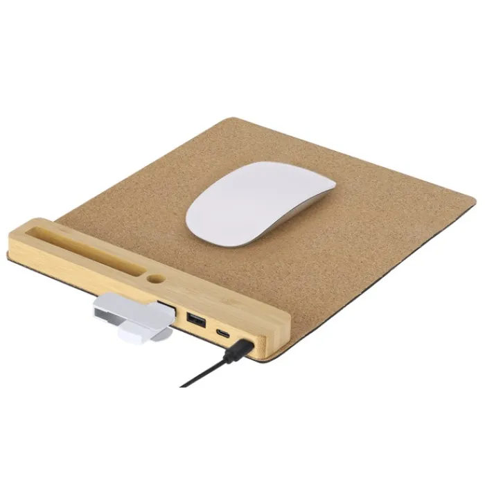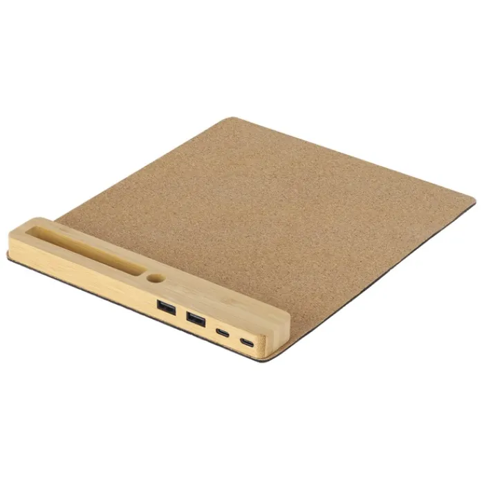 Tappetino per mouse multifunzionale realizzato in una combinazione di sughero morbido e bambù. Antiscivolo e stabile, garantisce un’esperienza utente confortevole. Sulla base in bambù include un supporto per smartphone, uno spazio porta penna, un ingresso Tipo-C, con cavetto incluso, un’uscita tipo C e 2 uscite USB, con funzione di sincronizzazione dei dati. Realizzato con elementi a base vegetale per promuovere l’uso di materie prime naturali e ridurre le emissioni inquinanti. Materiali come il bambù promuovono l’uso di materie prime naturali, riducendo così le emissioni inquinanti. Proviene da una pianta altamente resistente e versatile, con crescita e rigenerazione rapide, rendendola un’eccellente alternativa all’uso del legno tradizionale.