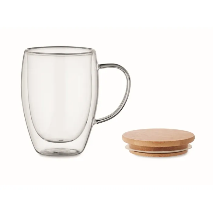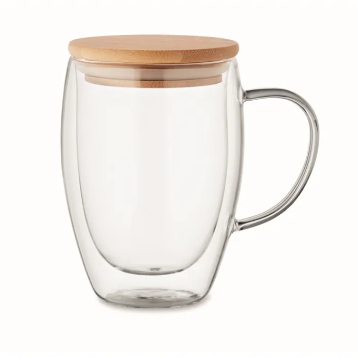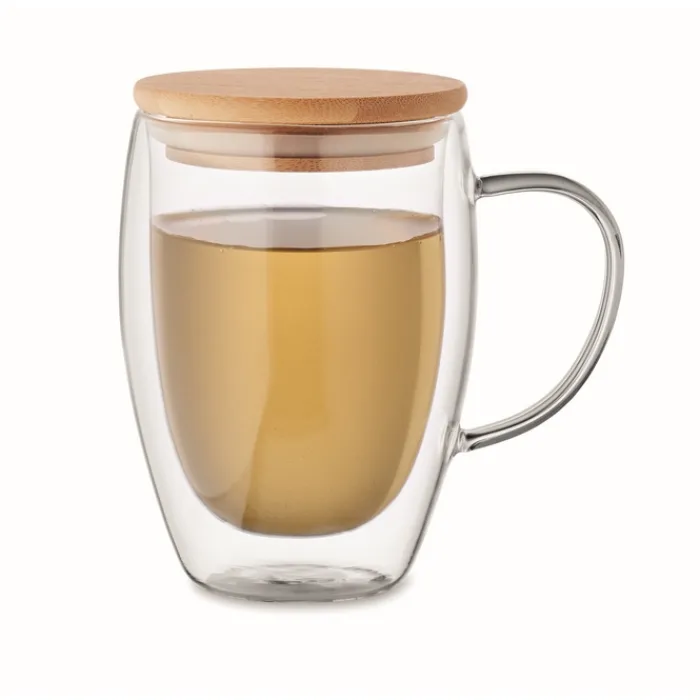 Tazza in vetro borosilicato a doppio strato con coperchio in bambù. Capacità: 300 ml.