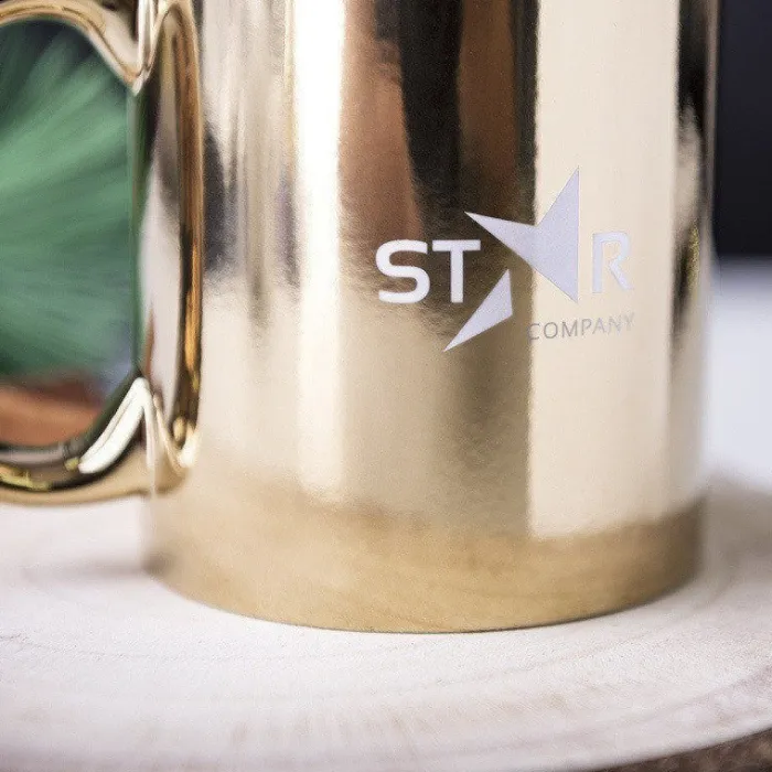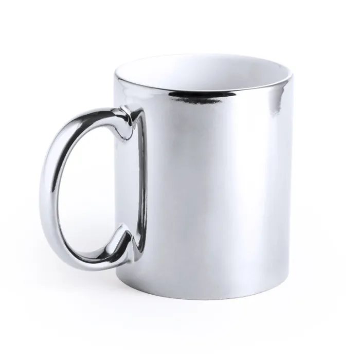 Tazza in ceramica da 350 ml con finitura lucida in oro o argento ed interno in bianco. Dotata di uno speciale rivestimento esterno che rende il logo perfettamente bianco, se viene inciso a laser. Presentata in scatola individuale. Non si può inserire nel microonde.