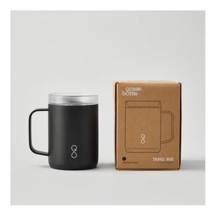 Tazza da viaggio Ocean Bottle da 350 ml che presenta un doppio strato termico per mantenere le bevande calde fino a 4 ore e fredde fino a 10 ore. Il manico ergonomico consente di agganciarla a borse o altri oggetti per ottimizzare lo spazio e la capacità di trasporto. realizzata in acciaio inossidabile riciclato al 90% e altri materiali riciclati. Ogni tazza è completamente neutra in carbonio (non contribuisce all’aumento delle emissioni di anidride carbonica nell’atmosfera) e serve a finanziare la raccolta di 1.000 bottiglie di plastica per migliorare i mezzi di sussistenza nelle comunità costiere. Fornita in una confezione regalo in cartone riciclato di provenienza responsabile.