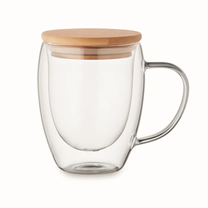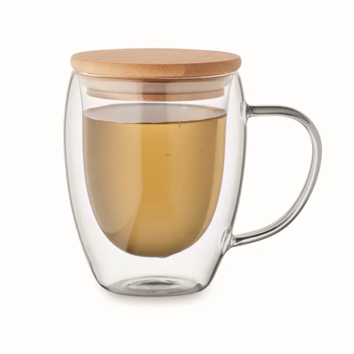 Tazza in vetro borosilicato a doppio strato con coperchio in bambù. Capacità: 250 ml.