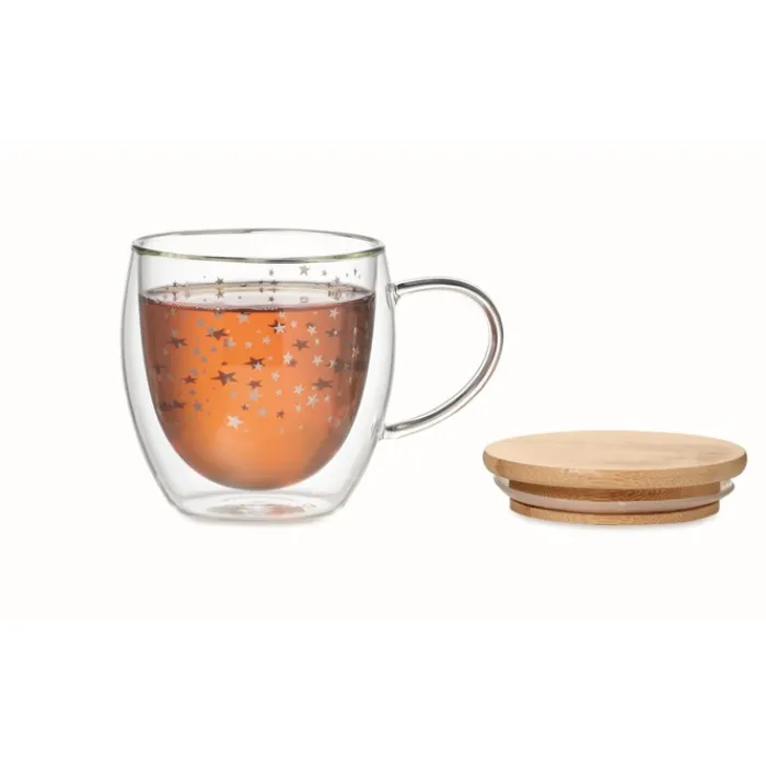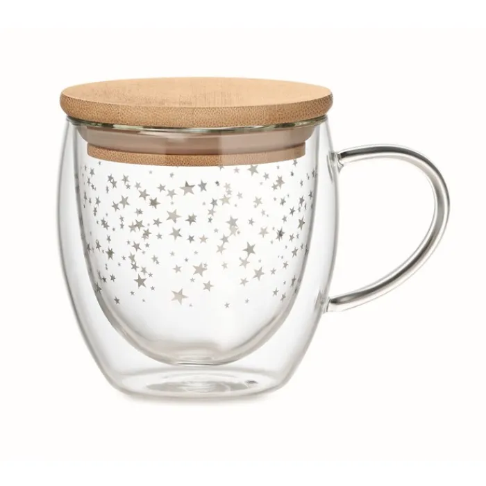 Tazza in vetro borosilicato a doppio strato con disegno di stelle. Ha un coperchio di bambù che può essere utilizzato come sottobicchiere. Capacità: 220 ml. Il vetro borosilicato è perfetto per contenere liquidi caldi. Il bambù è un materiale naturale, per cui possono verificarsi leggere variazioni di colore tra un tappo e l’altro.