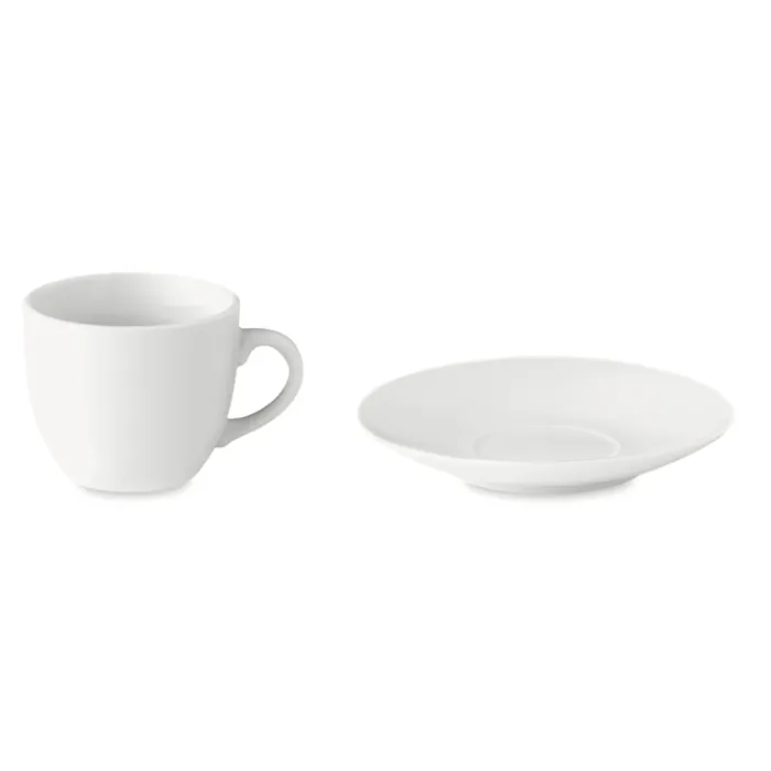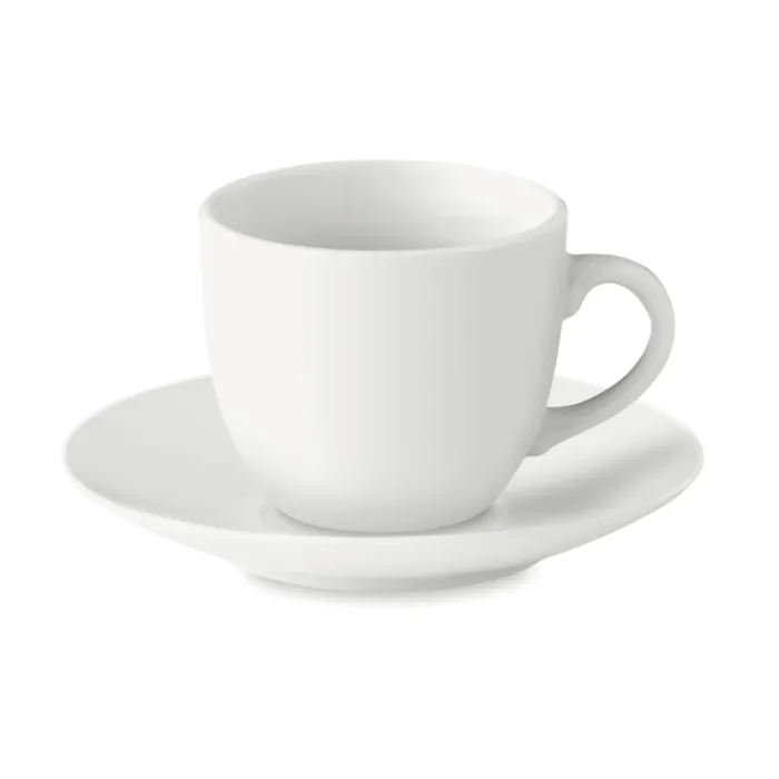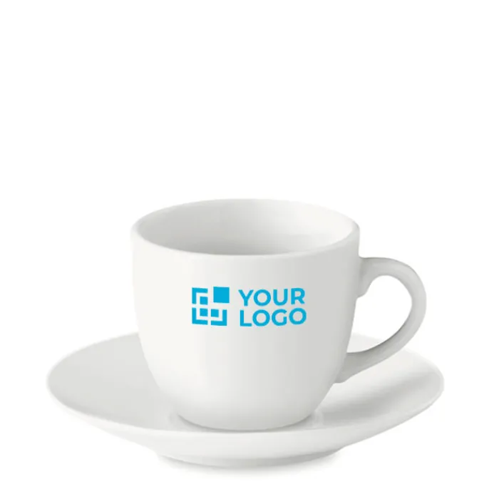 Tazzine da caffè personalizzate in ceramica con piattino. Sono leggermente più grandi delle normali tazzine da caffè da bar, difatti hanno una capacità di 80 ml. Vengono personalizzate con il transfer ceramico che consente il lavaggio in lavastoviglie senza rovinare la stampa. Inoltre l’area di stampa si estende lungo tutto il bordo superiore della tazzina con un altezza di 15mm. Queste tazzine con logo sono perfette per bar e ristoranti, ma anche da tenere in ufficio a disposizione dei dipendenti che potranno prendersi un caffè, o offrirlo a dei clienti in visita, in queste tazzine in ceramica personalizzate col nome dell’azienda invece di usare i bicchierini di carta. Naturalmente, sono anche perfette da regalare ai clienti fedeli come premio fedeltà, magari in un servizio da 6, oppure singolarmente da distribuire in occasione di eventi promozionali.