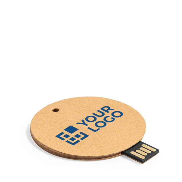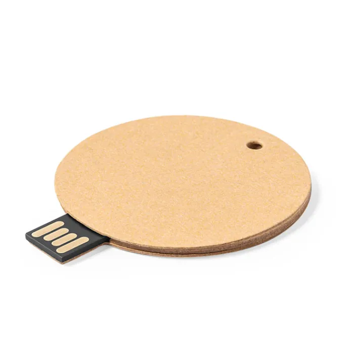 Chiavetta USB in cartone riciclato dalla forma rotonda. Presentata in una scatolina di cartone bianco individuale.