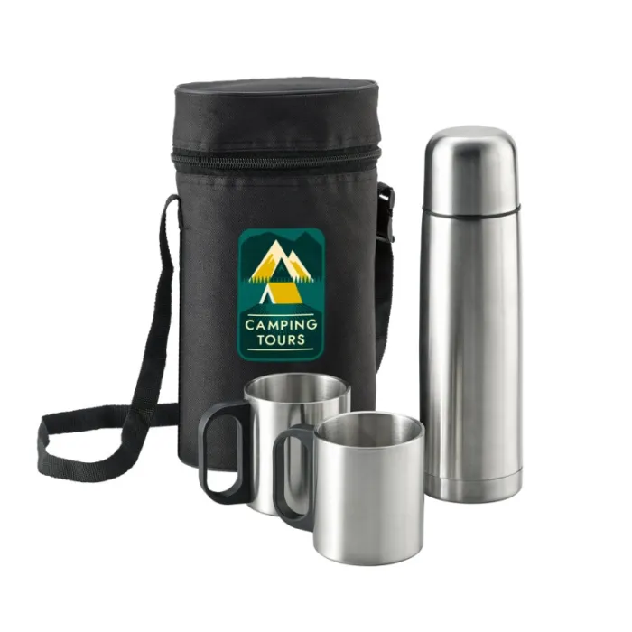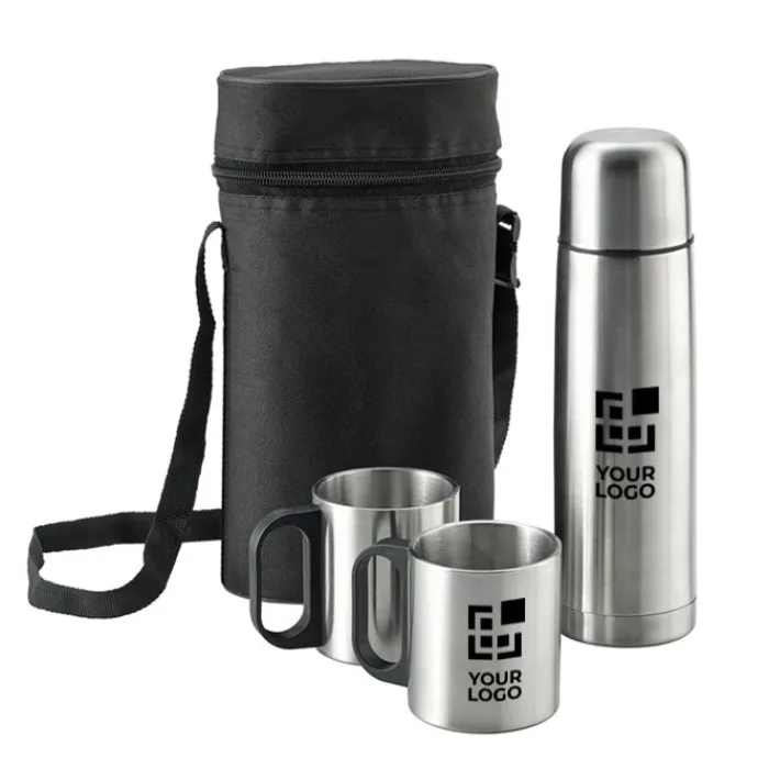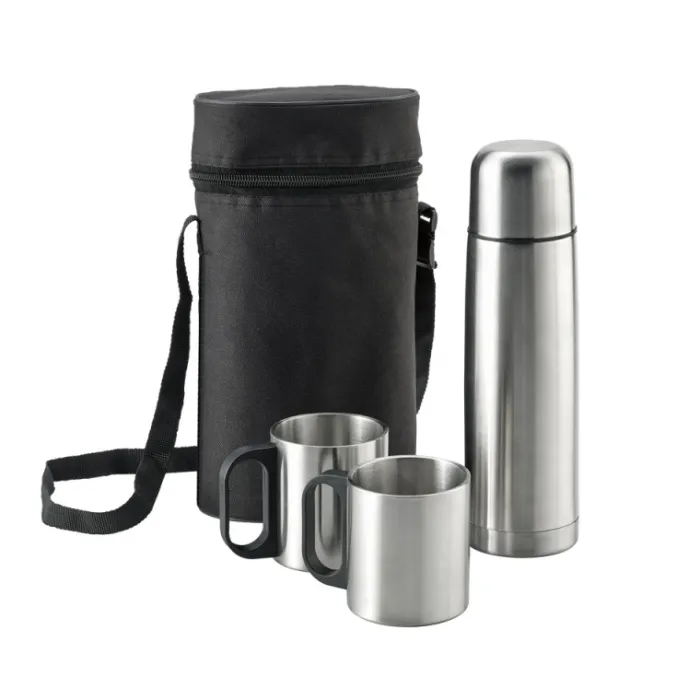 Set con thermos e tazze. Acciaio inossidabile. Con 2 tazze e custodia di 600D. Capacità del thermos: 500 ml. Capacità della tazza: 200 ml.