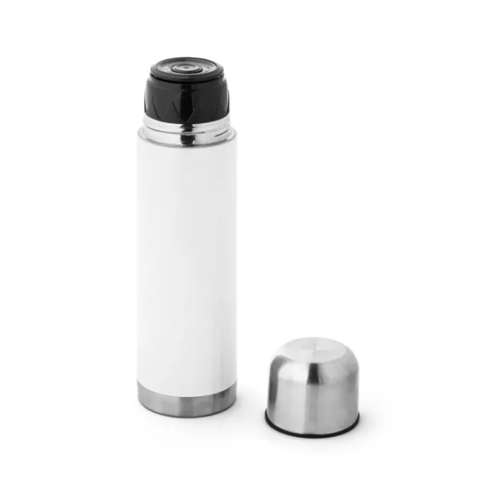 Thermos in acciaio inox a doppia parete con sistema sottovuoto e tappo. Capacità fino a 500 ml. Mantiene le bevande calde per circa 12 ore e fredde per circa 24 ore. Fornito in scatola.