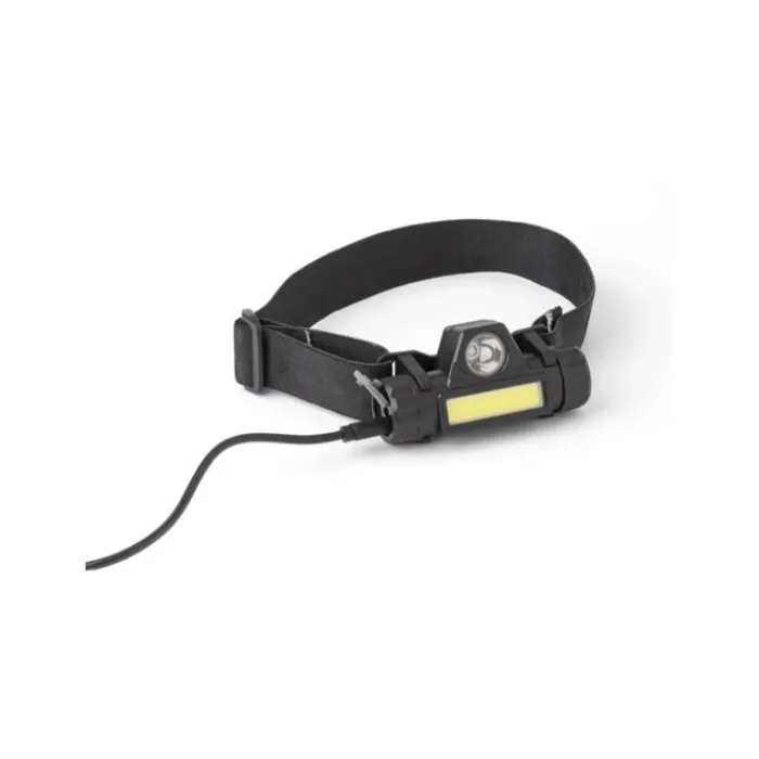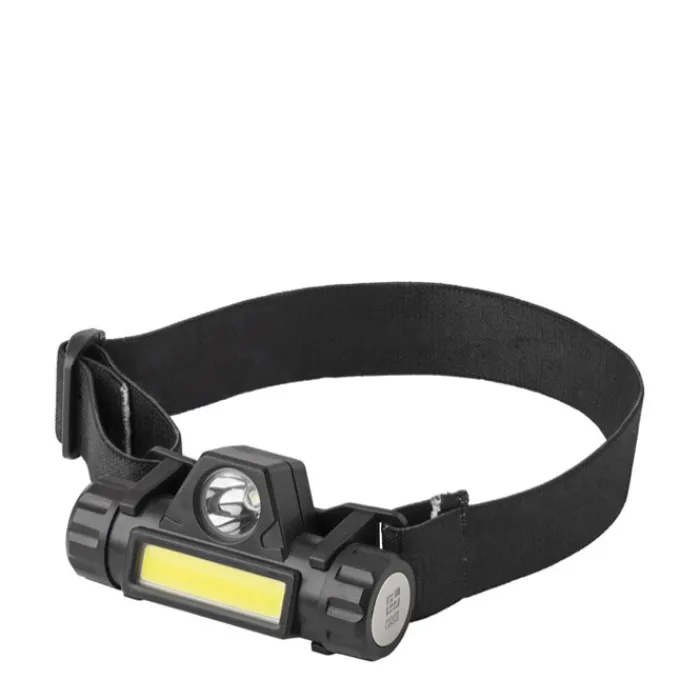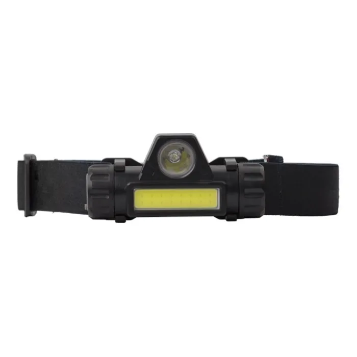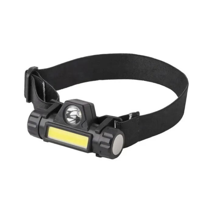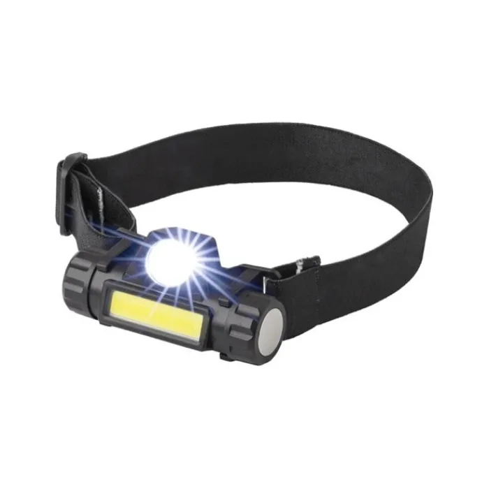Torcia da esplorazione ricaricabile in ABS, porta micro USB, composta da 1 luce LED e 1 luce COB, diverse modalità luci cliccando sul pulsante, la luce può essere inclinata per mirare e si stacca facilmente dall’archetto