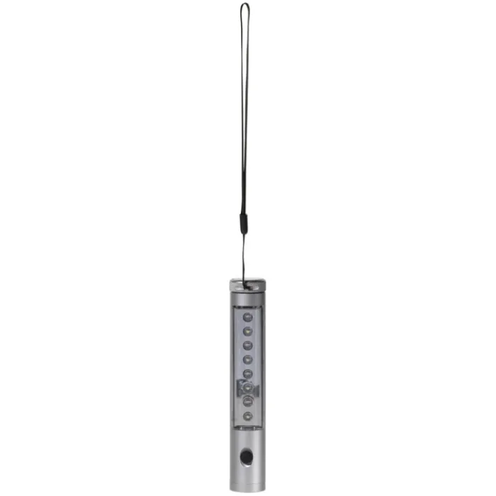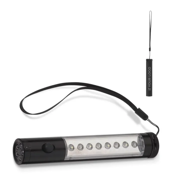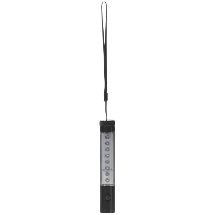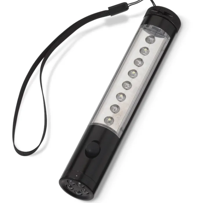 Torcia a 13 LED in alluminio con luce frontale e sul corpo. Modalità d’illuminazione continua e ad intermittenza. Parte posteriore con magnete. Include un laccetto da polso e 2 batterie AAA. Confezione regalo.