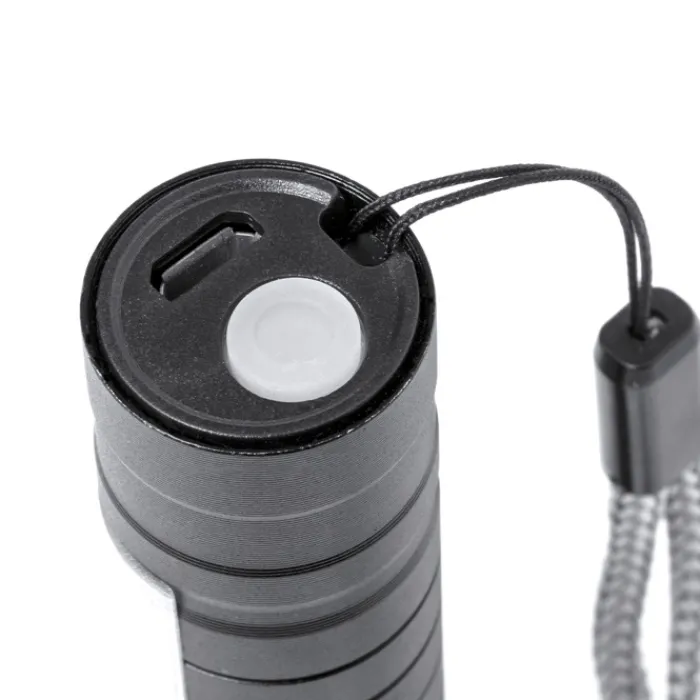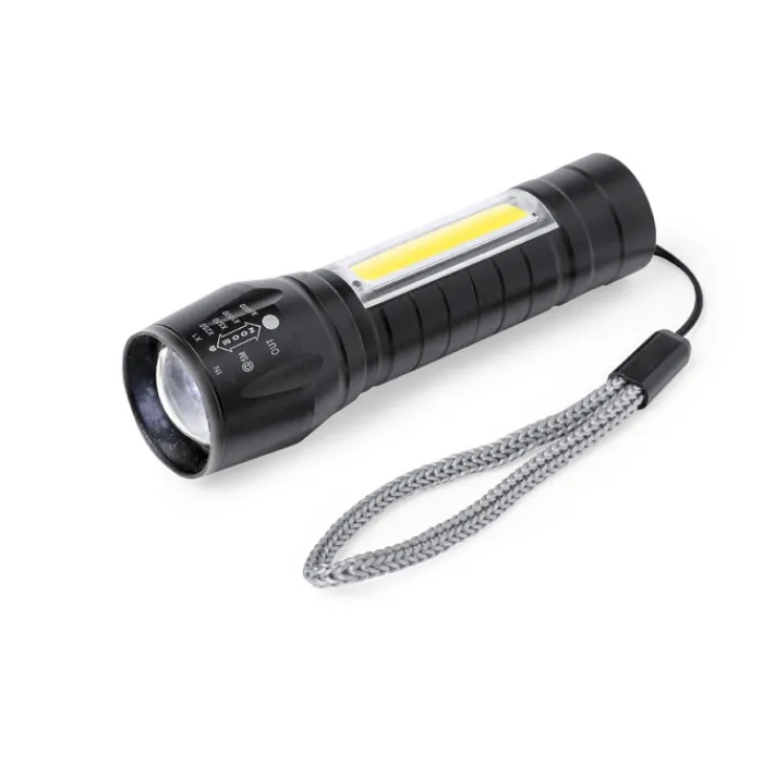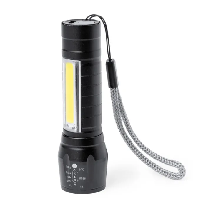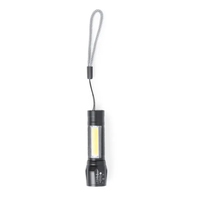 Potente torcia realizzata in alluminio con finitura nera e cordino da polso. Ha 1 LED e la testa regolabile, per avere una messa a fuoco più mirata o aperta. Inoltre, dispone di 10 luci COB nell’impugnatura e di tre modalità di illuminazione: fissa e lampeggiante a due velocità. Si alimenta con una batteria ricaricabile da 400 mAh con cavetto micro USB. Confezionata singolarmente in una scatola di design.