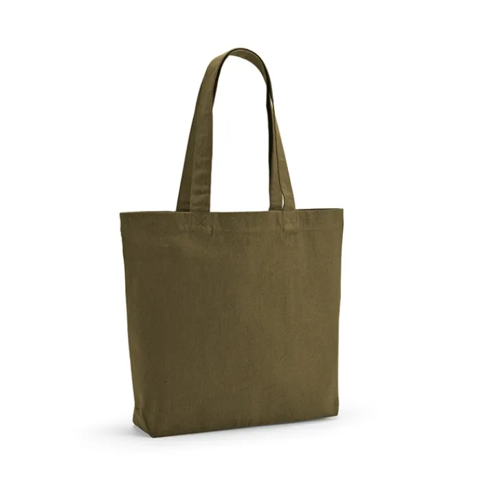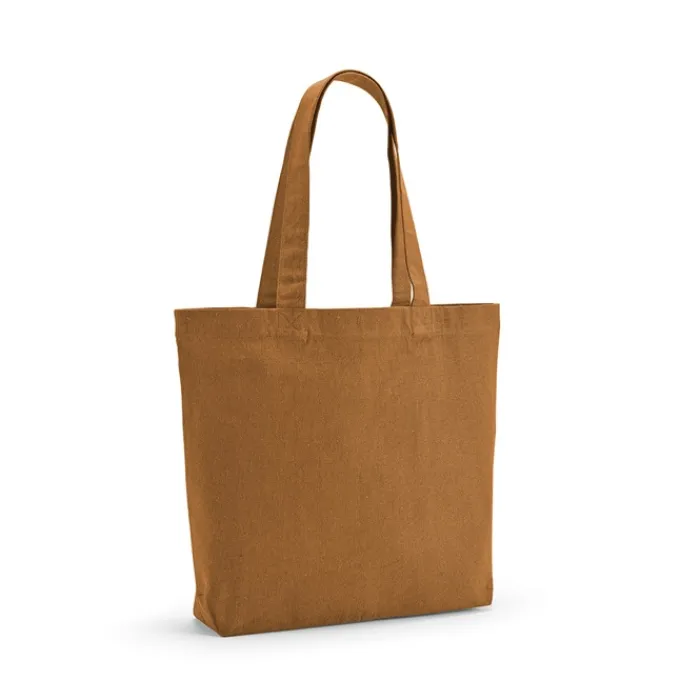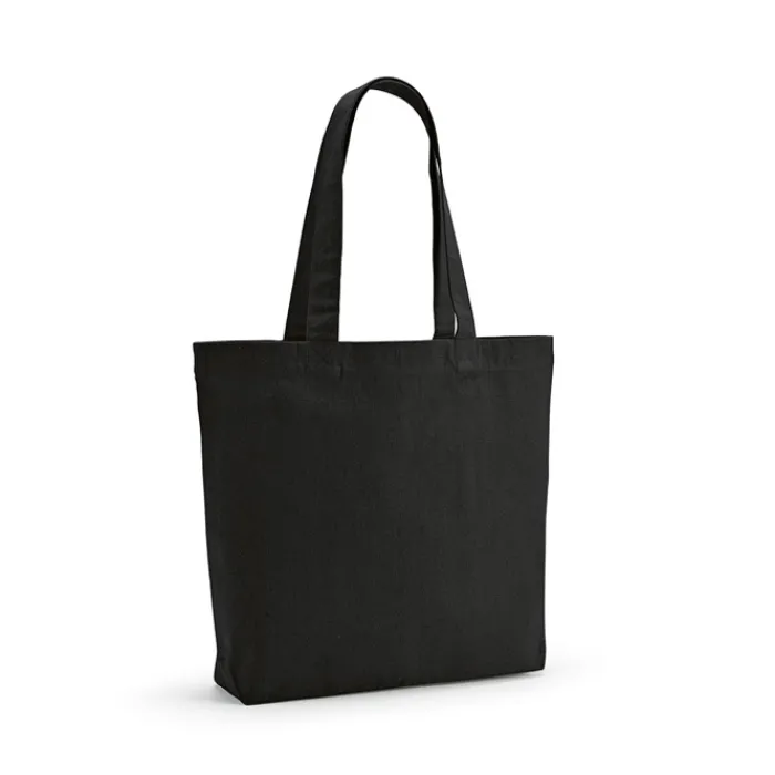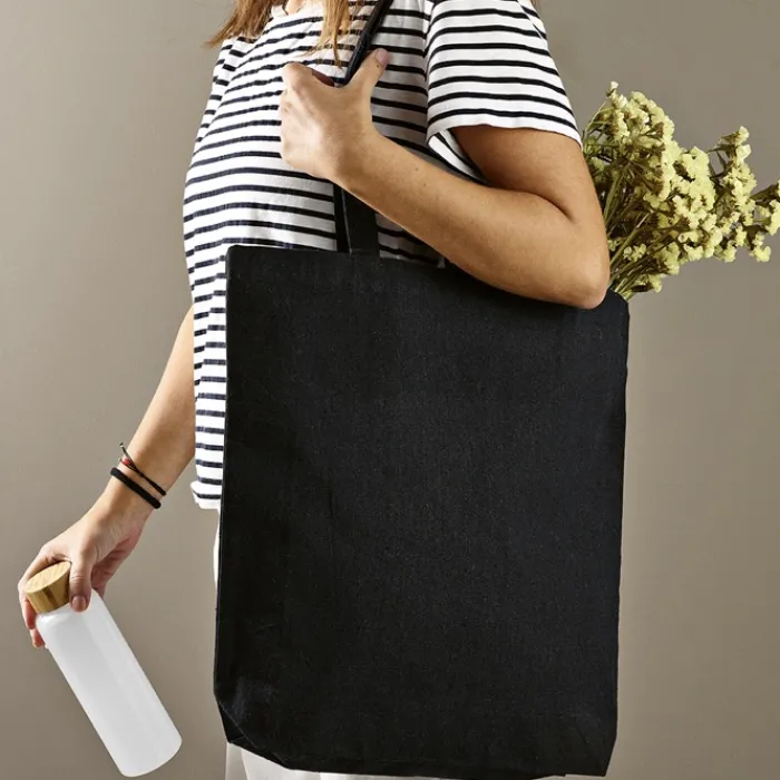 Tote bag vivace ed ecologica, realizzata al 70% con cotone riciclato da 220 g/m² e al 30% con poliestere riciclato. Ha dimensioni spaziose grazie al soffietto da 10 cm. I manici da 65 cm garantiscono comodità.