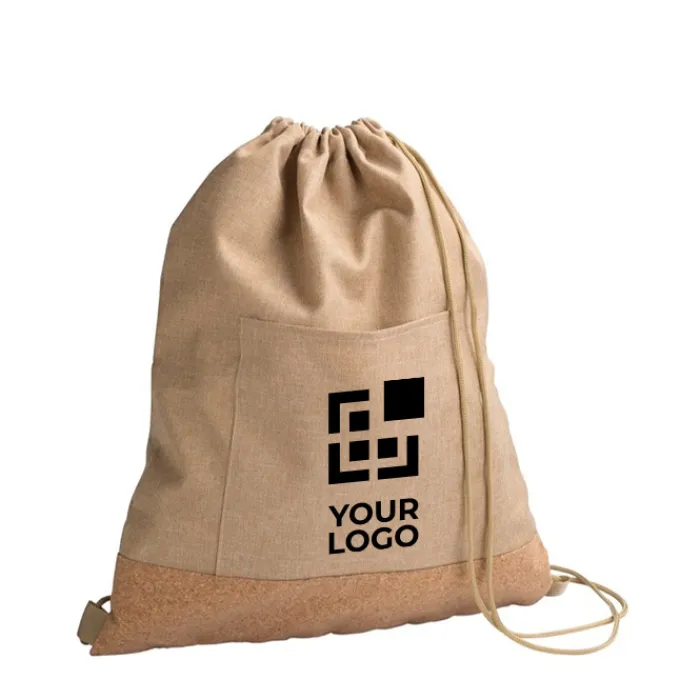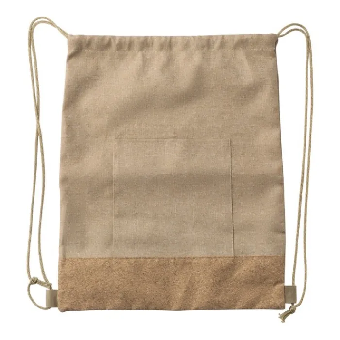 Zainetto a sacca con chiusura a coulisse, in poliestere 600 D rPET con base in sughero. Presenta una piccola tasca sul davanti e l’etichetta dell’rPET.