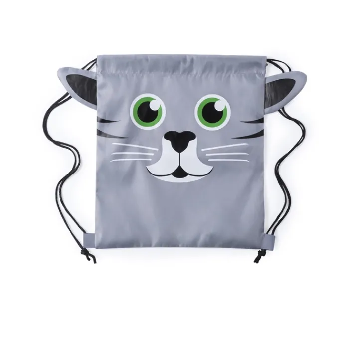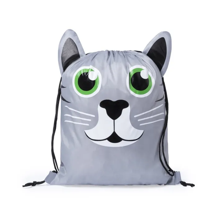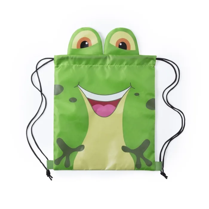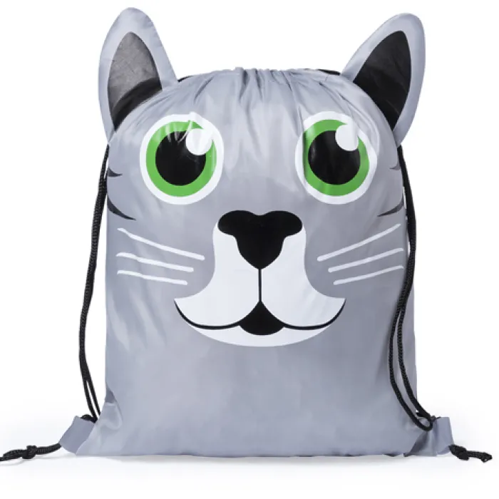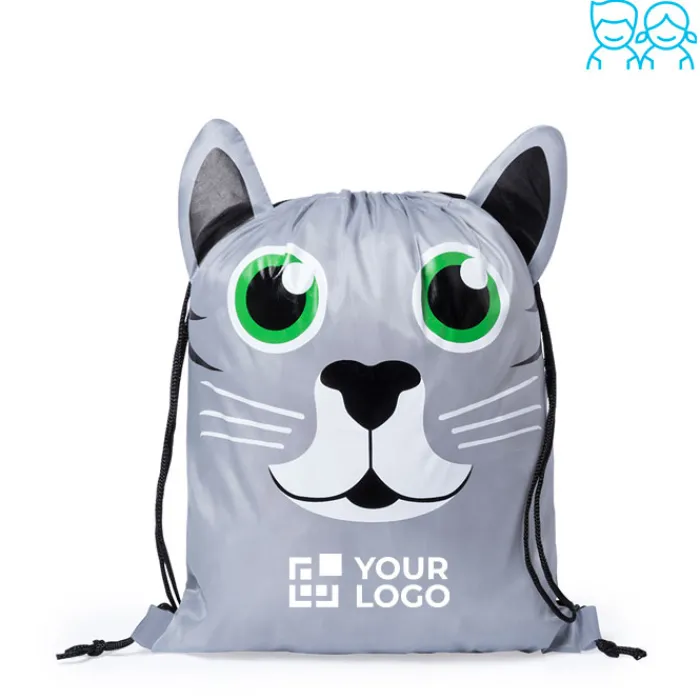Zainetto con coulisse per bambini, realizzato in morbido poliestere 210T. Corde autobloccanti nere e angoli rinforzati. Ogni colore corrisponde ad un animale differente: verde – rana; azzurro – elefante e grigio – gatto.