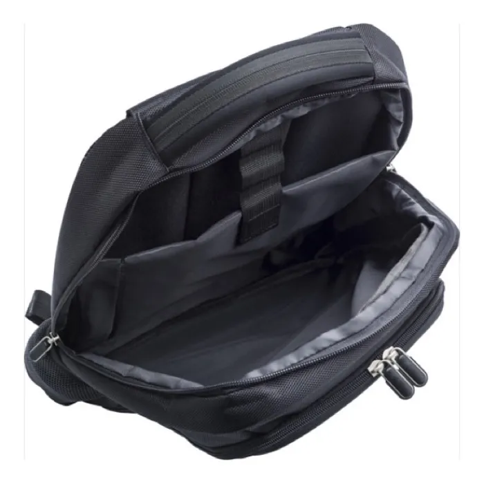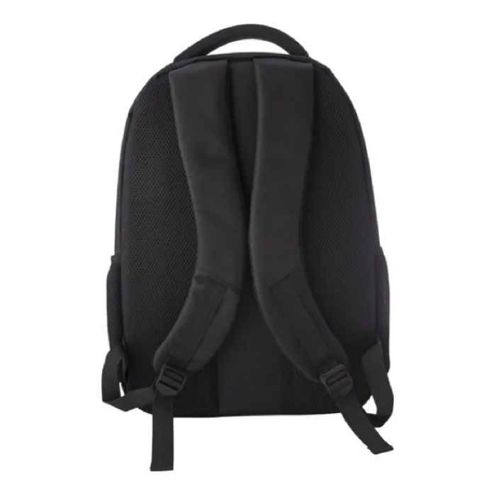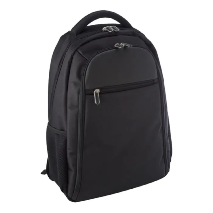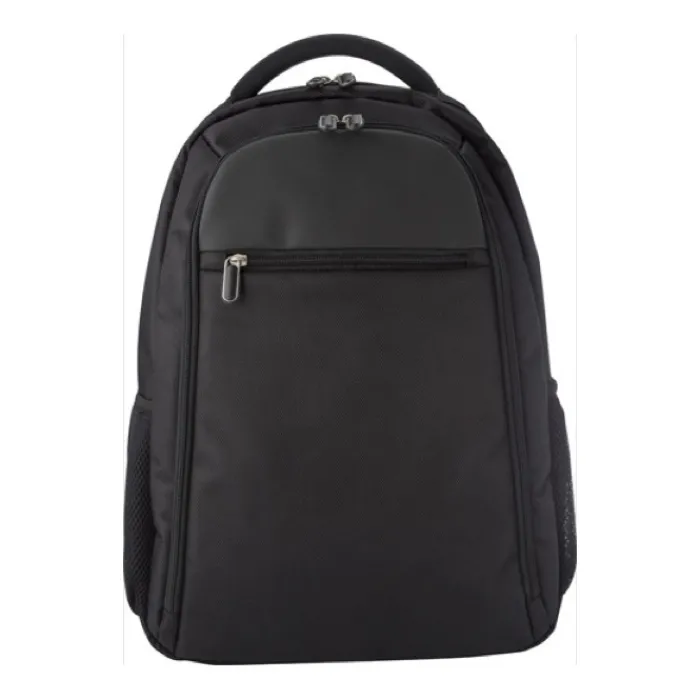Zaino in poliestere 1680 D con ampio scomparto principale con tasca per computer da 15 pollici. Tasca frontale con zip, tasche laterali a rete, schienale imbottito e spallacci regolabili.