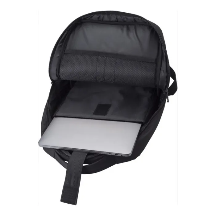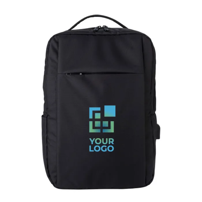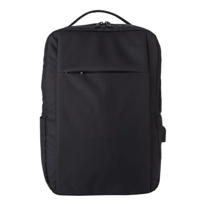 Zaino porta pc in RPET 300 D con dettagli 210 D. Ha una tasca specifica per contenere un portatile da 16” con chiusura in velcro. Tasche multiple all’interno, tasca frontale con chiusura lampo e su un lato presenta una porta USB con cavetto all’interno.