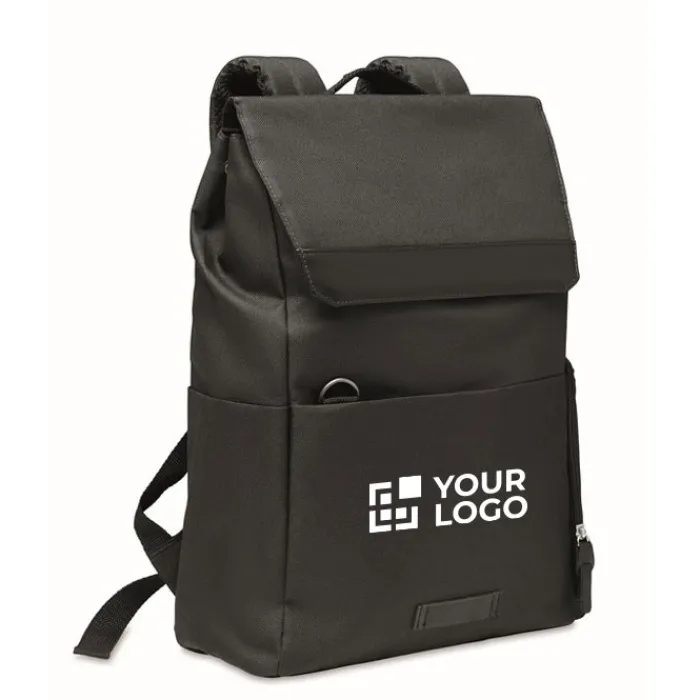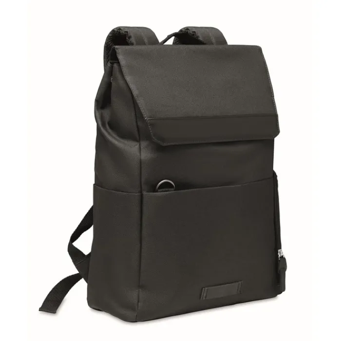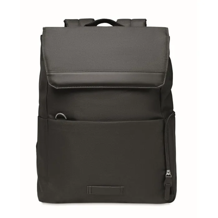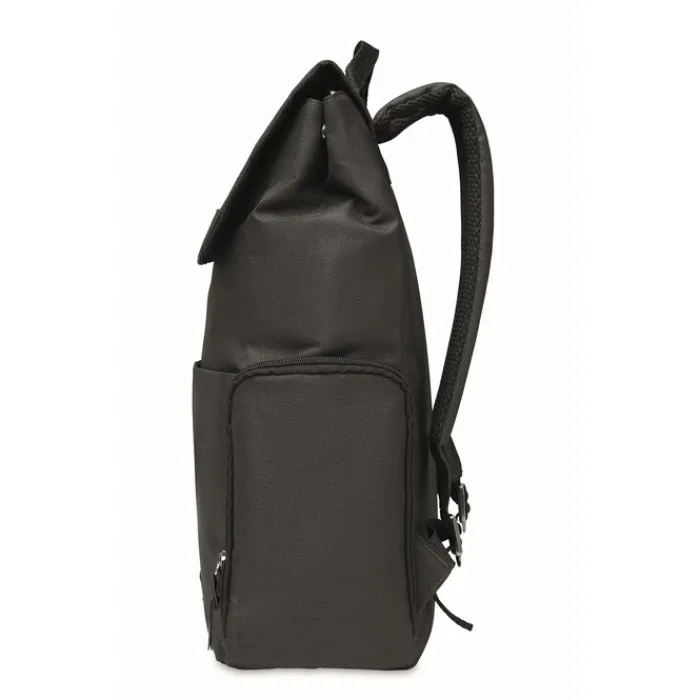 Zaino in 600D RPET jensato con scomparto imbottito per computer da 15 pollici con bottone a pressione magnetico. Dotato di una tasca frontali con zip e 2 tasche laterali.