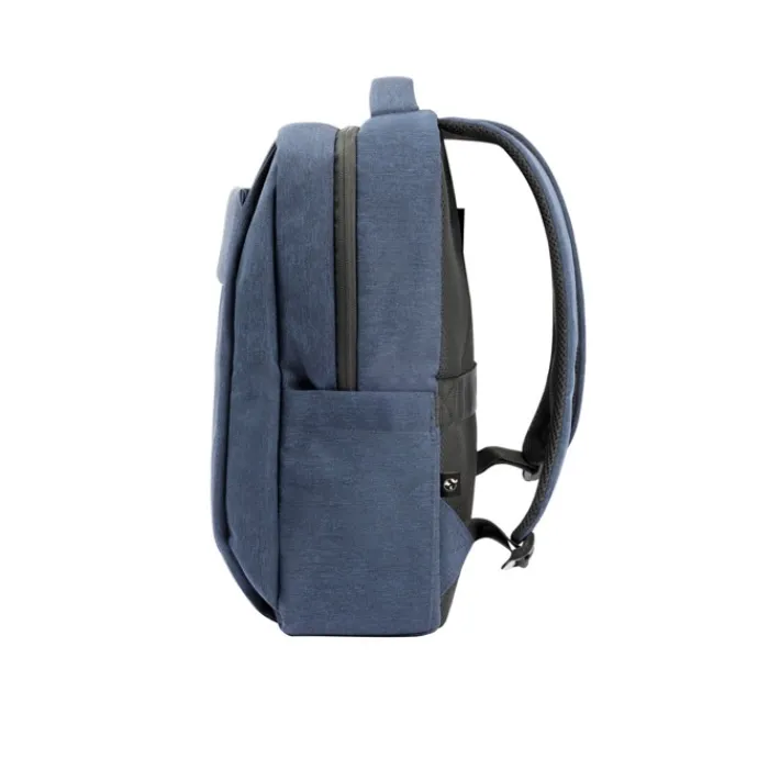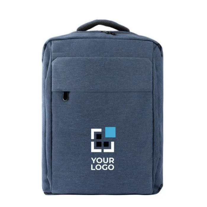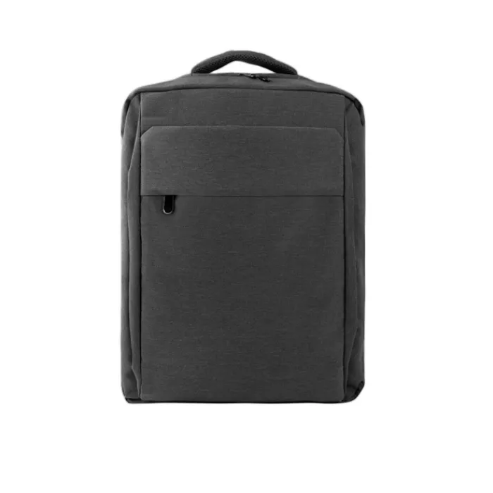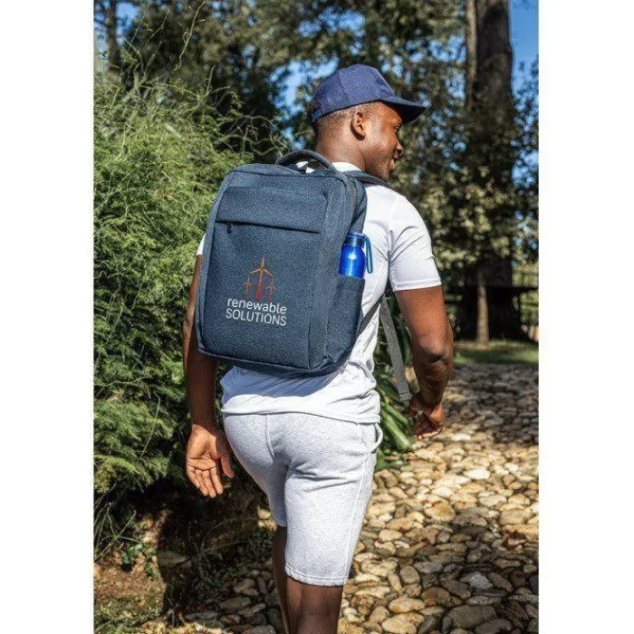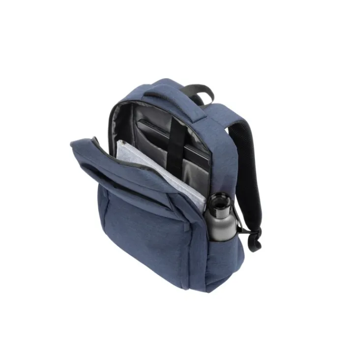Zaino porta laptop completamente imbottito in poliestere riciclato ad alta densità 300D e fodera in poliestere riciclato 210D. Ha uno scomparto principale per laptop fino a 15,6″ e diverse tasche. 2 tasche anteriori con cerniera e 1 tasca laterale per trasportare la bottiglia. La parte posteriore presenta una cinghia per trolley in caso di necessità. Capacità fino a 18L