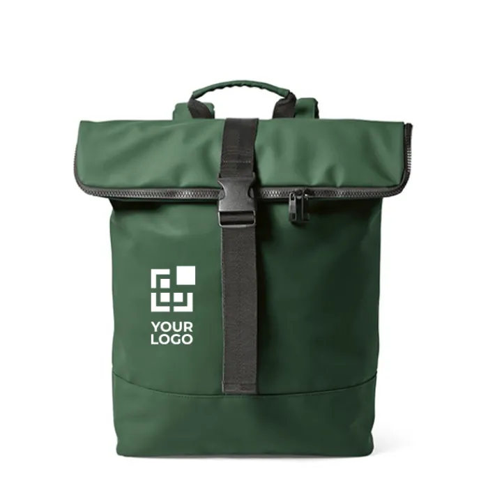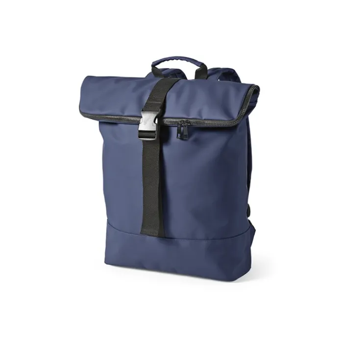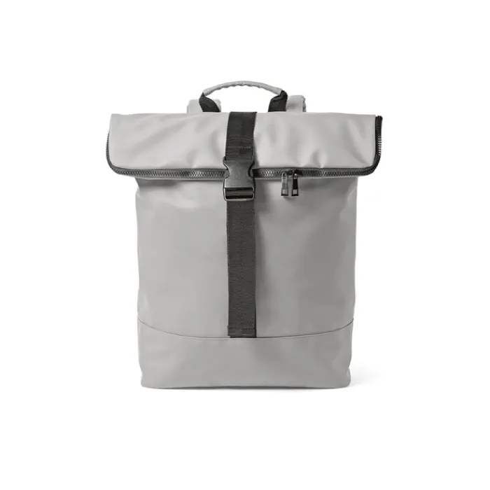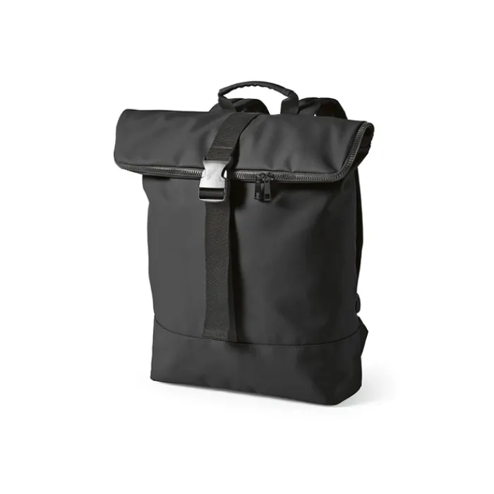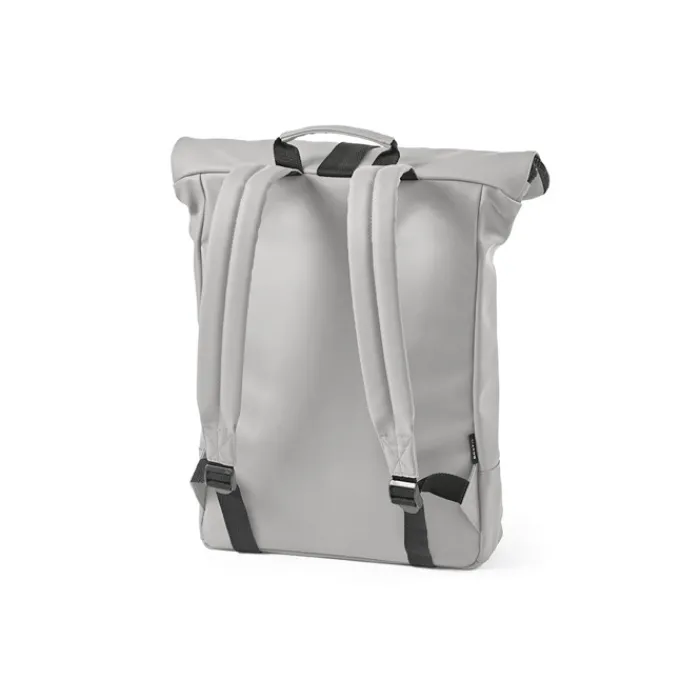 Zaino da 24 litri realizzato con PU riciclato e confezionato in una borsa individuale in cotone riciclato. Scomparto principale con tasca imbottita per un computer portatile fino a 15,6″. Schienale imbottito, spallacci regolabili e fascia posteriore per il trolley.