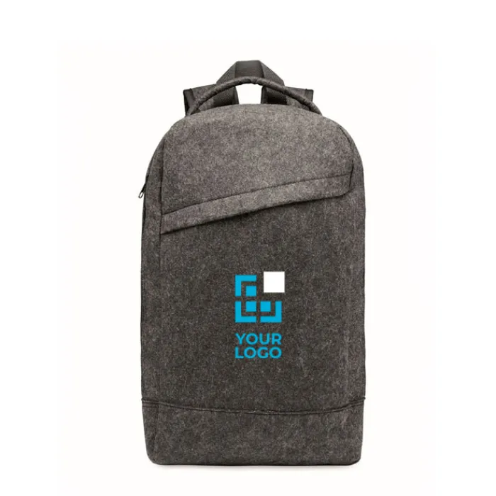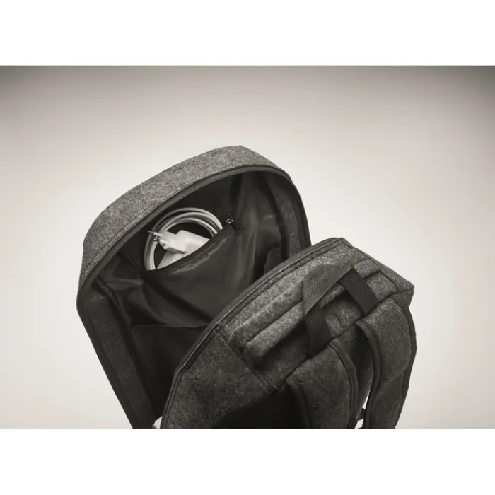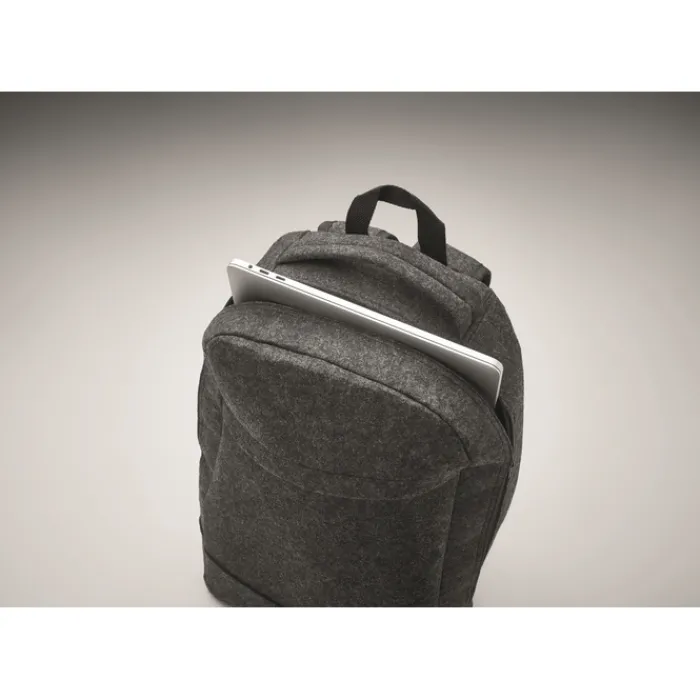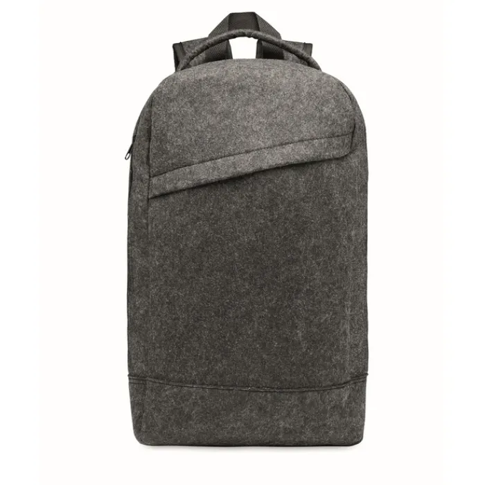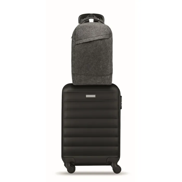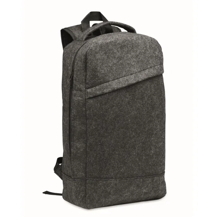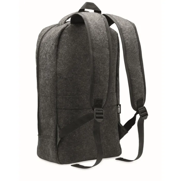 Zaino realizzato in feltro RPET con spallacci imbottiti e maniglia. con scomparto principale interno. Scomparto principale con cerniera che dispone di una tasca porta pc da 13 pollici. Tasca anteriore con zip. Fascia per agganciarlo al trolley sul retro.